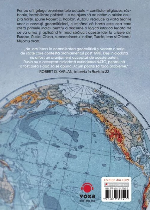 Pentru a înțelege evenimentele actuale – conflicte religioase, războaie, instabilitate politică – e de ajuns să aruncăm o privire asupra hărții, spune Robert D. Kaplan. Autorul readuce la viață teoriile unor cunoscuți geopoliticieni, susținând că harta este cea care oferă primele indicii pentru a discerne o logică istorică legată de ce va urma și aplicând în mod strălucit aceste idei la crizele din Europa, Rusia, China, subcontinentul indian, Turcia, Iran și Orientul Mijlociu arab.