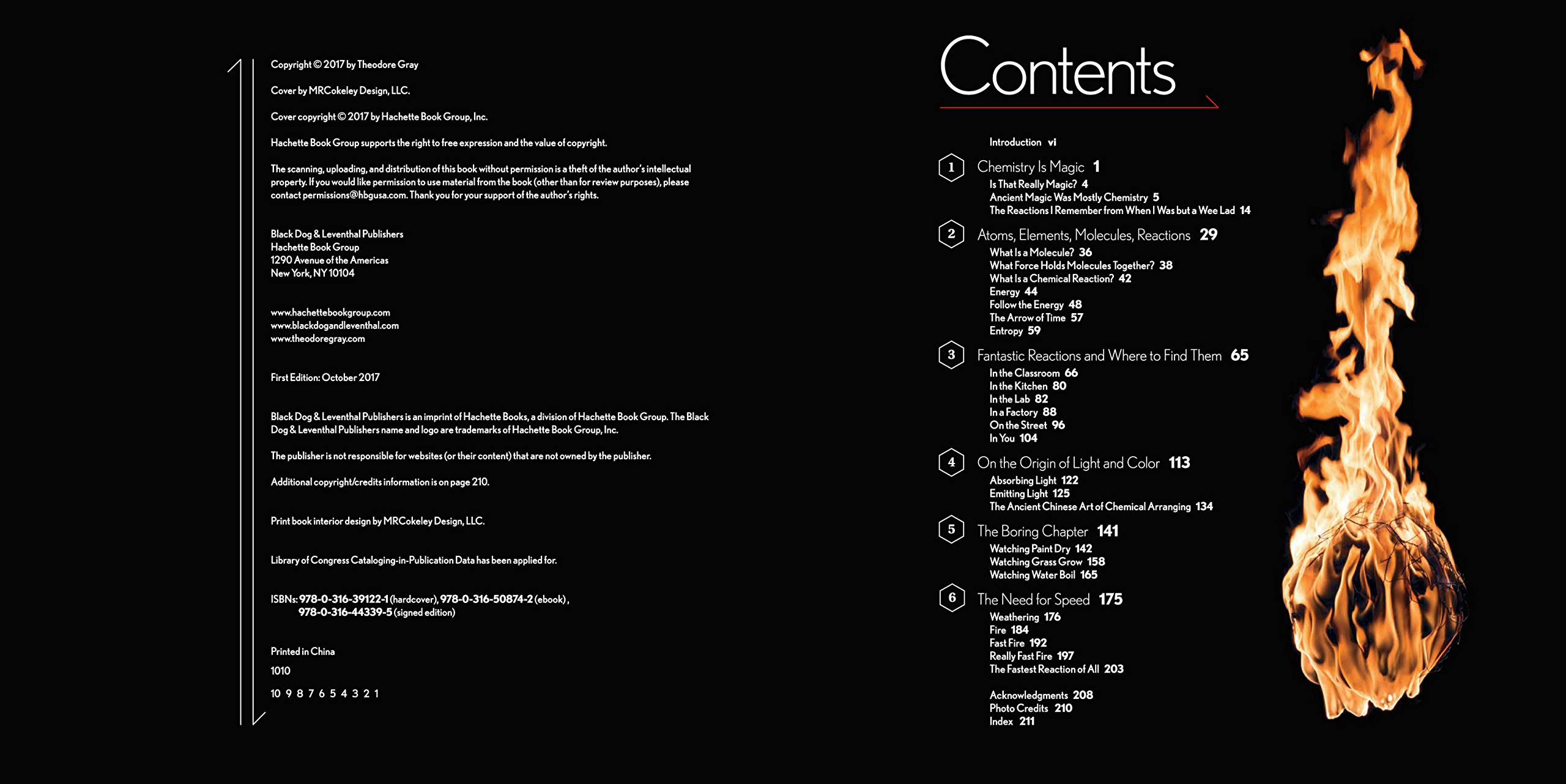 With The Elements, Gray gave us a never-before-seen, mesmerizing photographic view of the 118 elements in the periodic table. In Molecules, he showed us how the elements combine to form the content that makes up our universe. With Reactions, Gray once again puts his photography and storytelling to work to demonstrate how molecules interact in ways that are essential to our very existence. The book begins with a brief recap of elements and molecules and then goes on to explain important concepts that characterize a chemical reaction, including Energy, Entropy, and Time. It is then organized by type of reaction including chapters such as "Fantastic Reactions and Where to Find Them," "On the Origin of Light and Color," "The Boring Chapter," in which we learn about reactions such as paint drying, grass growing, and water boiling, and "The Need for Speed," including topics such as weather, ignition, and fire.