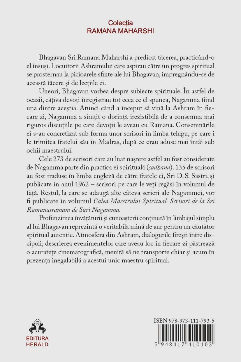 Profunzimea invataturii si cunoasterii continuta in limbajul simplu al lui Bhagavan reprezinta o veritabila mina de aur pentru un cautator spiritual autentic. Atmosfera din Ashram, dialogurile firesti intre discipoli, descrierea evenimentelor care aveau loc in fiecare zi pastreaza o acuratete cinematografica, menita sa ne transporte chiar si acum in prezenta inegalabila a acestui unic maestru spiritual.