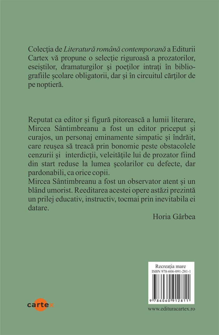 Reputat ca editor si figura pitoreasca a lumii literare, Mircea Santimbreanu a fost un editor priceput si curajos, un personaj eminamente simpatic si indragit, care reusea sa treaca prin bonomie peste obstacolele cenzurii si interdictii, veleitatile lui de prozator fiind din start reduse la lumea scolarilor cu defecte, dar pardonabili, ca orice copii. Mircea Santimbreanu a fost un observator atent si un bland umorist. Reeditarea acestei opere astazi reprezinta un prilej educativ, instructiv, tocmai prin inevitabila ei datare. - Horia Garbea
