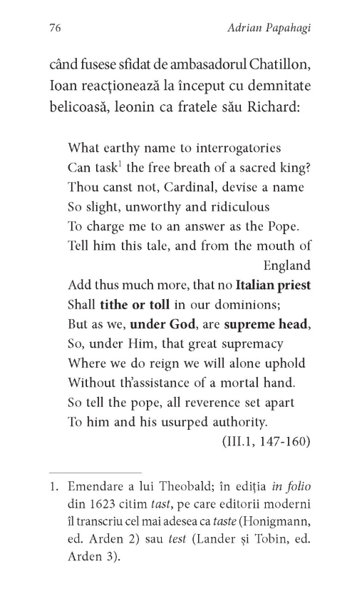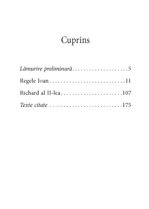 În Regele Ioan și în Richard al II-lea Shakespeare pune în scenă marile dileme teologico-politice ale epocii sale. Se poate justifica revolta împotriva unui rege rău? Dar uzurparea? Regele e unsul lui Dumnezeu; odată consacrat, corpul politic al regelui e sacru și se unește cu cel al națiunii. Și totuși, în corpul său muritor, regele e un om ca oricare altul, adesea împovărat de vicii. Ca teatrul Globe, coroana e goală în mijloc: ea cuprinde zbaterile regalității și ale comunei mortalități, într-un spectacol deopotrivă grandios și iluzoriu. Cât valorează și ce simte capul unui rege, bun sau rău, încununat de acest zero aurit bătut cu diamante, ce facem fiecare pe marginea sau în centrul celuilalt zero, teatrul vanității lumii?