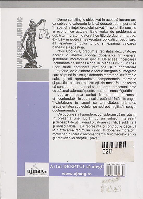 Noul Cod civil, precum şi legislaţia dezvoltatoare acordă o atenţie sporită dobânzilor în general şi dobânzii moratorii în special. De aceea, încercarea încununată de succes a dnei dr. Maria Dumitru, în lipsa unor studii doctrinare profunde şi cuprinzătoare în materie, de a elabora o teorie integrală şi integrată care să pună în discuţie dobânda moratorie, cu formele sale, şi să aprofundeze componentele teoretice şi practice ale unei construcţii de acest fel, indiferent că sunt de drept material sau de drept procesual, este cu atât mai valoroasă pentru literatura noastră juridică.