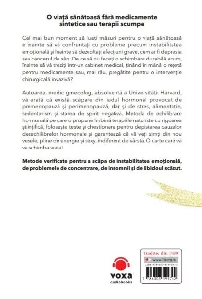 Autoarea, medic ginecolog, absolventă a Universității Harvard, vă arată că există scăpare din iadul hormonal provocat de premenopauză și perimenopauză, dar și de stres, alimentație, sedentarism și starea de spirit negativă. Metoda de echilibrare hormonală pe care o propune îmbină terapiile naturiste cu rigoarea științifică, folosește teste și chestionare pentru depistarea cauzelor dezechilibrelor hormonale și garantează că vă veți simți din nou vesele, pline de energie și sexy, indiferent de vârstă. O carte care vă va schimba viața!