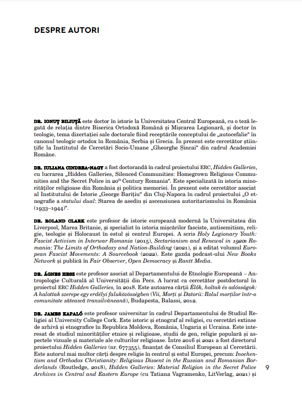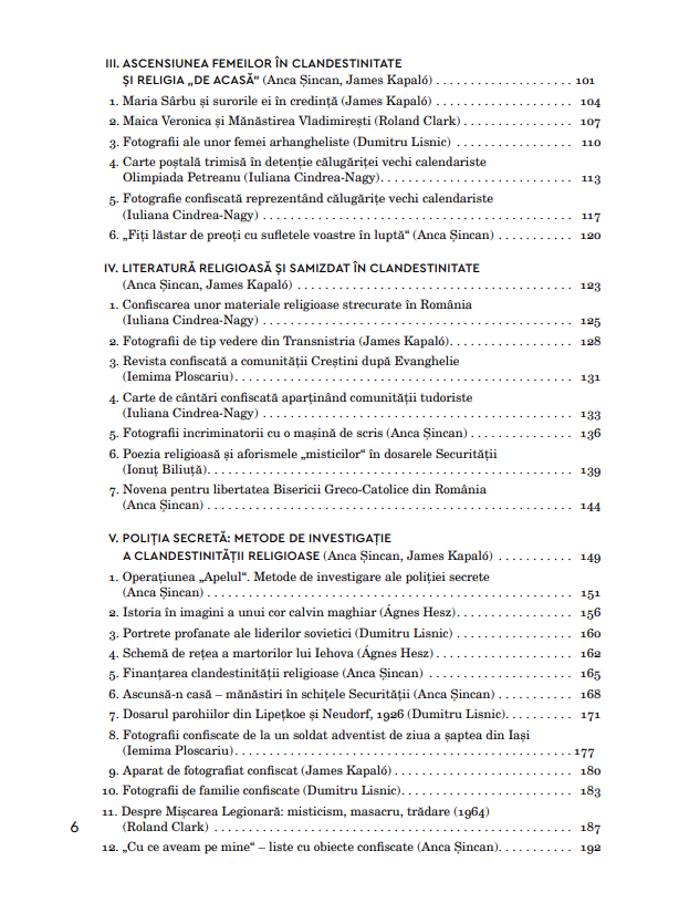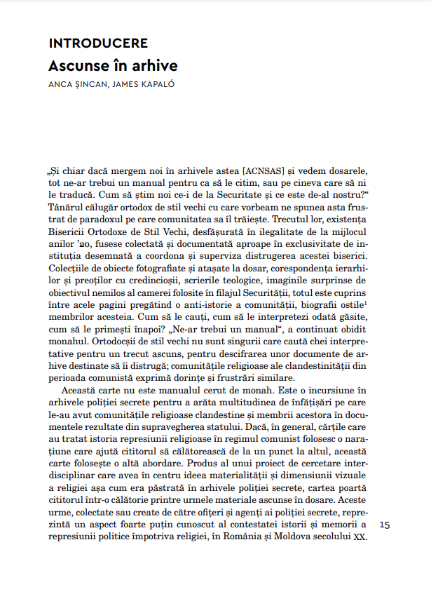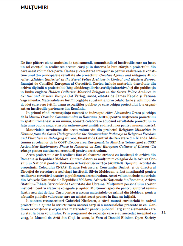 „Mărturiile strânse în paginile acestei cărți ca urmare a unui efort migălos de filtrare, clasificare și conservare a mii de documente identificate în arhive înfățișează modurile în care poliția secretă din România comunistă monitoriza, controla și influența activitatea unor minorități religioase despre care știm încă foarte puține.