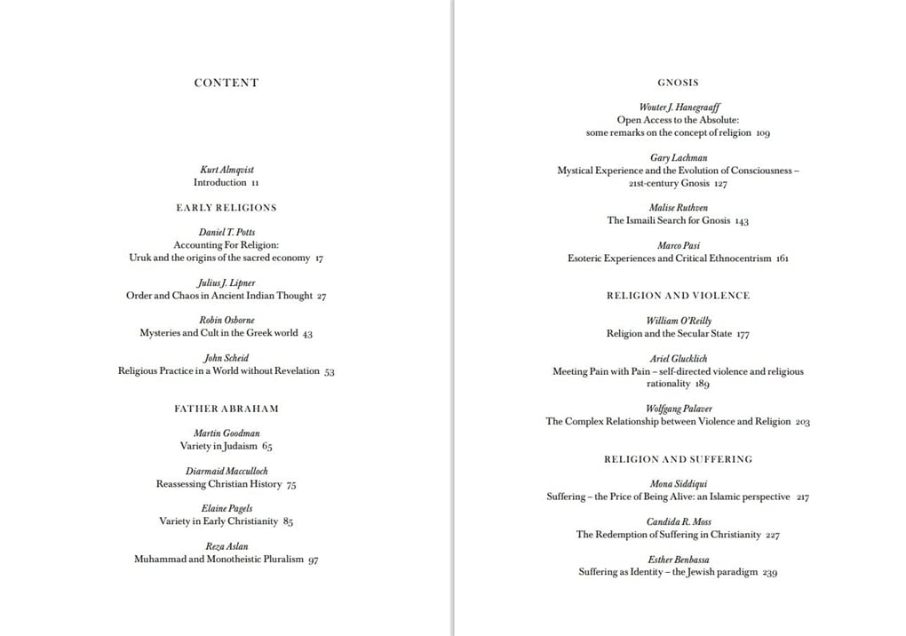 Contributors include: Reza Aslan, Benedetta Berti, Jessica Frazier, Armin W. Geertz, Ariel Glucklich, Martin Goodman, Wouter J. Hanegraaff, Gary Lachman, Julius J. Lipner, Diarmaid Macculloch, Janne Haaland Matláry, Simon May, Richard Miles, Candida R. Moss, William O'Reilly, Robin Osborne, Elaine Pagels, Wolfgang Palaver, Marco Pasi, Daniel T. Potts, Chakravarthi Ram-Prasad, Göran Rosenberg, Malise Ruthven, John Scheid, Mona Siddiqui, Pär Stenbäck, Jayne Svenungsson, Harvey Whitehouse, A.N. Wilson and Adrian Wooldridge.