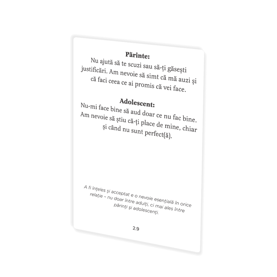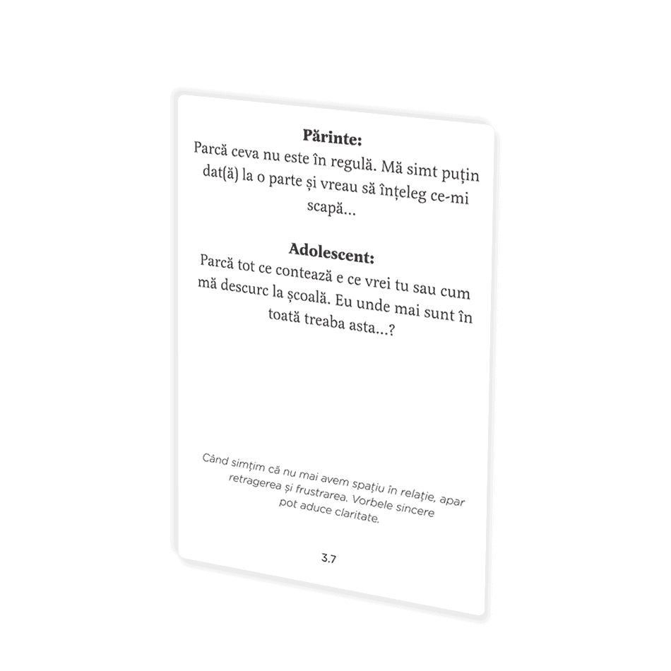 Fiecare card conține un mesaj-cheie, o „replică ce contează“, care poate deveni acel instrument magic de care ai nevoie în momentele tensionate sau delicate din relația cu adolescentul sau adolescenta din familia ta.