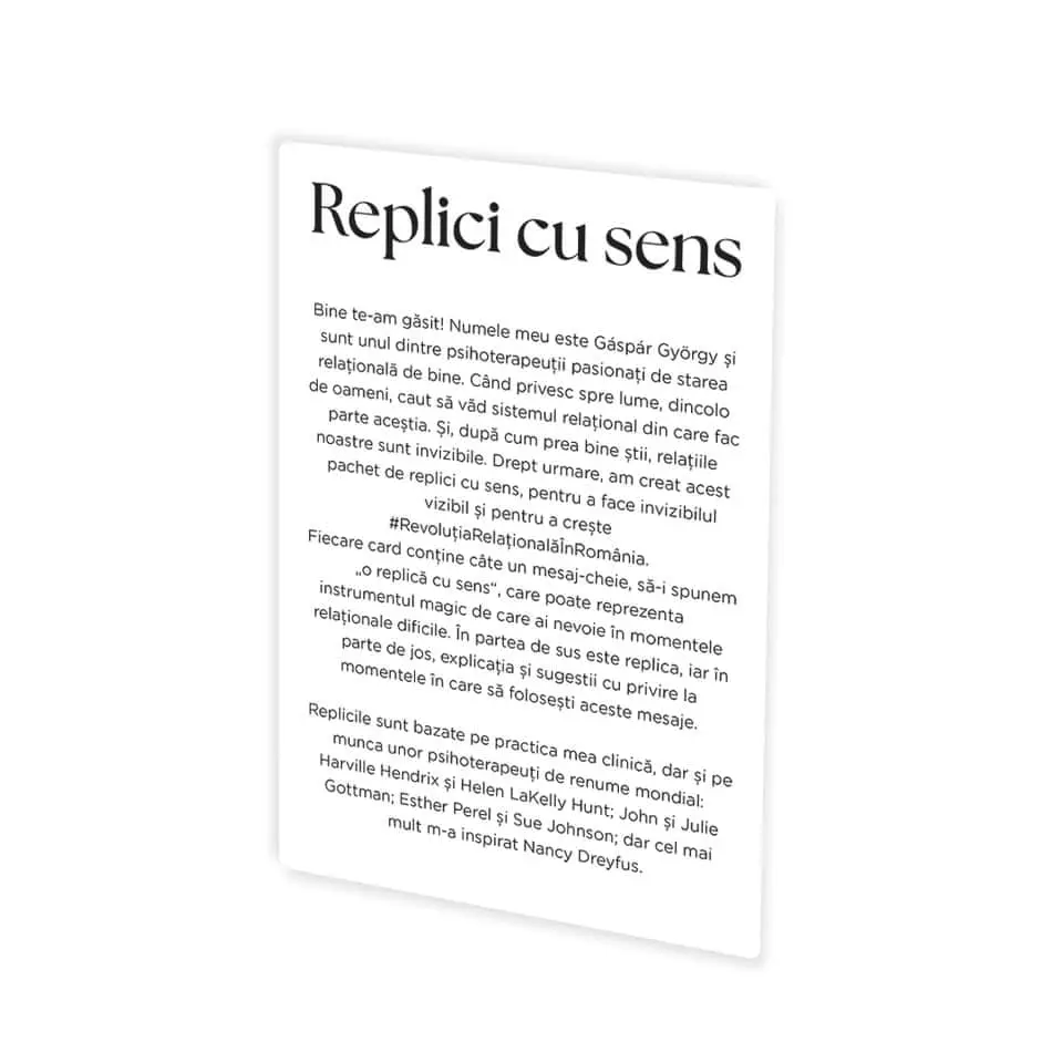 Fiecare card conține câte un mesaj-cheie, să-i spunem „o replică cu sens“, care poate reprezenta instrumentul magic de care ai nevoie în momentele relaționale dificile.