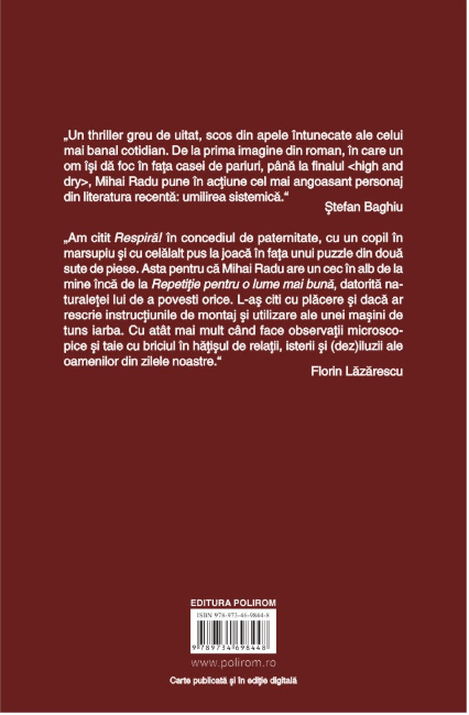 „Am citit Respiră! în concediul de paternitate, cu un copil în marsupiu și cu celălalt pus la joacă în fața unui puzzle din două sute de piese. Asta pentru că Mihai Radu are un cec în alb de la mine încă de la Repetiție pentru o lume mai bună, datorită naturaleței lui de a povesti orice. L-aș citi cu plăcere și dacă ar rescrie instrucțiunile de montaj și utilizare ale unei mașini de tuns iarba.