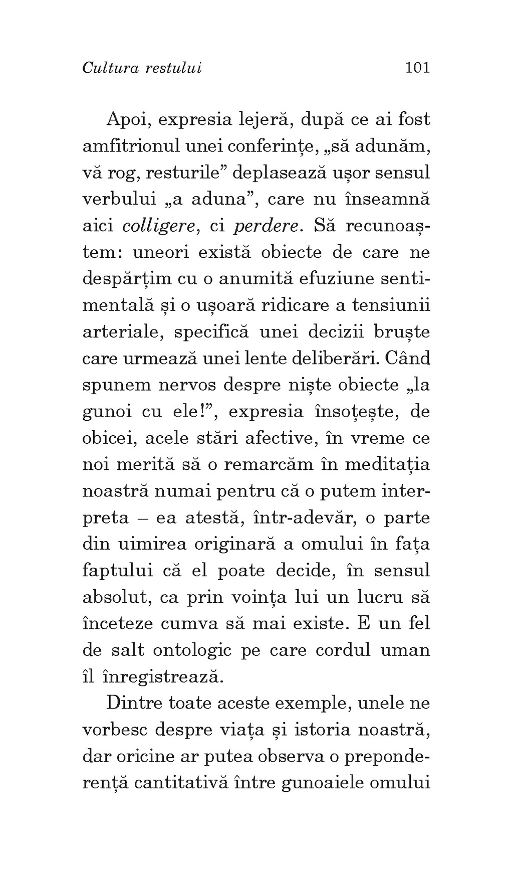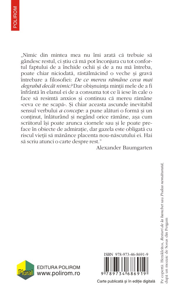 „Nimic din mintea mea nu îmi arată că trebuie să gândesc restul, ci știu că mă pot înconjura cu tot confortul faptului de a închide ochii și de a nu mă întreba, poate chiar niciodată, răstălmăcind o veche și gravă întrebare a filosofiei: De ce mereu rămâne ceva mai degrabă decât nimic? Dar obișnuința minții mele de a fi înfrântă în elanul ei de a consuma tot ce îi iese în cale o face să resimtă anxios și continuu că mereu rămâne «ceva ce ne scapă». Și chiar aceasta ascunde inevitabil sensul verbului a concepe: a pune alături o formă și un conținut, înlăturând și negând orice rămâne, așa cum scriitorul își poate arunca ciornele sau și le poate preface în obiecte de admirație, dar gazela este obligată cu riscul vieții să mănânce placenta nou‑născutului ei. Hai să scriu atunci o carte despre rest.” (Alexander Baumgarten) Alexander Baumgarten (n. 1972) este profesor de istoria filosofiei medievale la Universitatea „Babeş‑Bolyai” din Cluj‑Napoca şi membru al Uniunii Scriitorilor din România. A publicat ediţii, traduceri comentate şi exegeze ale unor autori precum Aristotel (din opera căruia a tradus Politica, Despre suflet şi Fizica), Plotin, Augustin, Grigore cel Mare, Anselm, Gerard din Cenad, Bernard din Clairvaux, Toma din Aquino, Godescalc din Nepomuk şi alţii. Coordonează, la Editura Polirom, colecţia „Biblioteca medievală”, în care au apărut din 2003 până în prezent 45 de volume bilingve ale operelor unor autori medievali din tradiţia latină, greacă, arabă sau franceză veche. Volumele sale de studii şi eseuri conţin reflecţii asupra filosofiei antice şi medievale, dar şi asupra receptării acestora în cultura română: Principiul cerului (Dacia, 2001; ediţia a II‑a, Humanitas, 2008), Sfântul Anselm şi conceptul ierarhiei (Polirom, 2003), Şapte idei înrâuritoare ale lui Aristotel (Humanitas, 2012), Vânătorul cu o singură săgeată (Ratio et Revelatio, 2013).