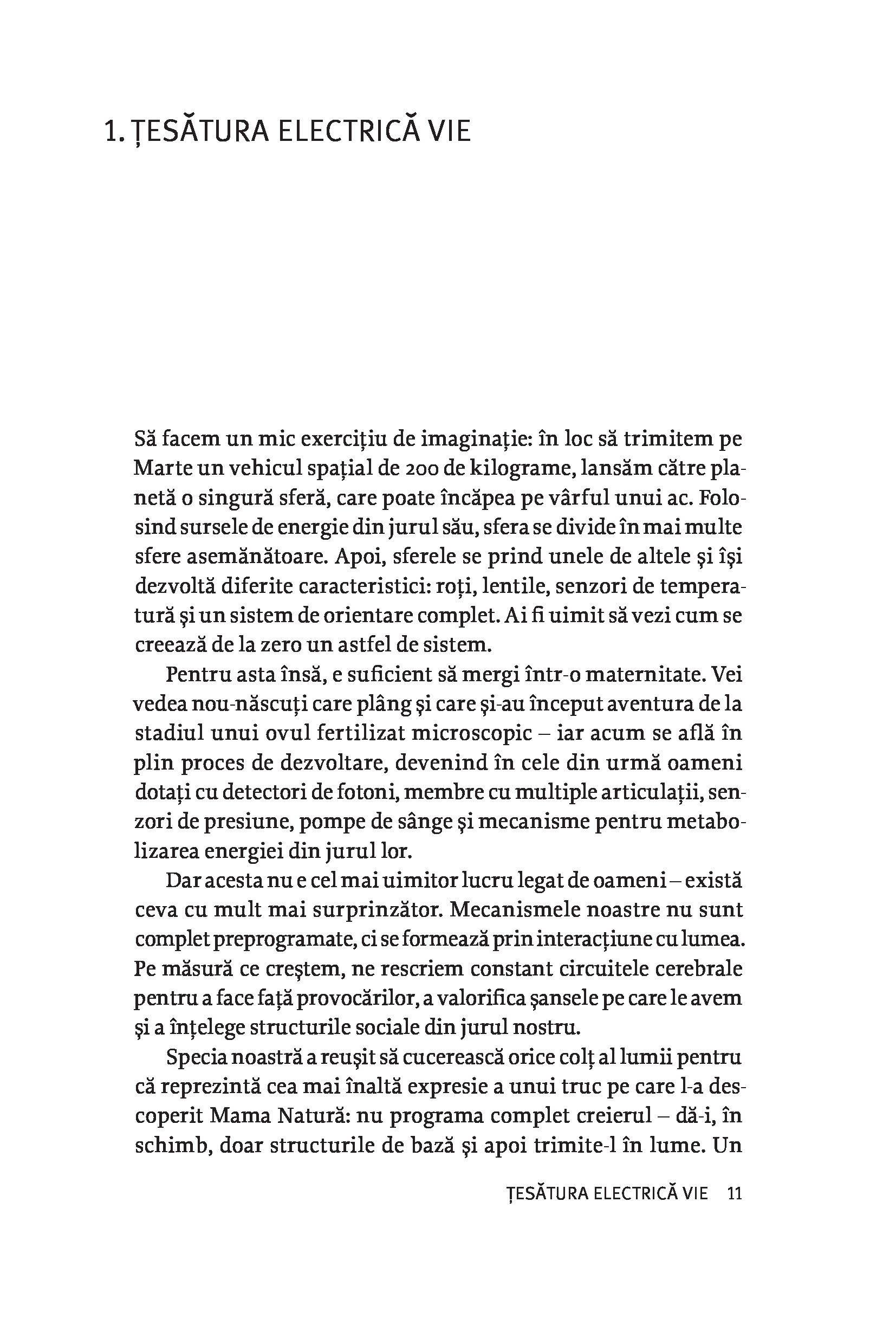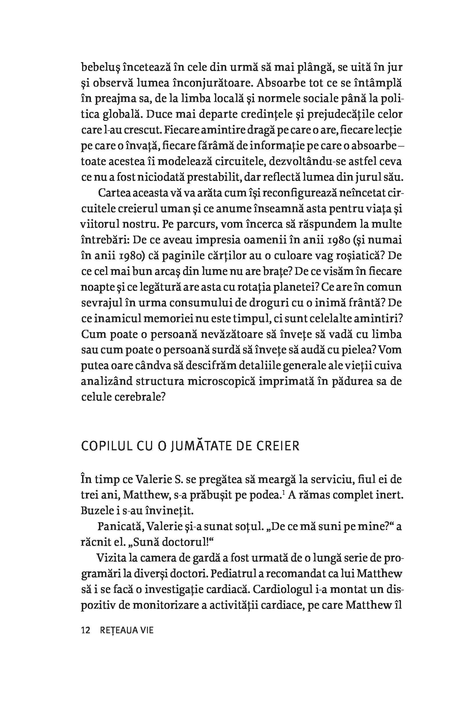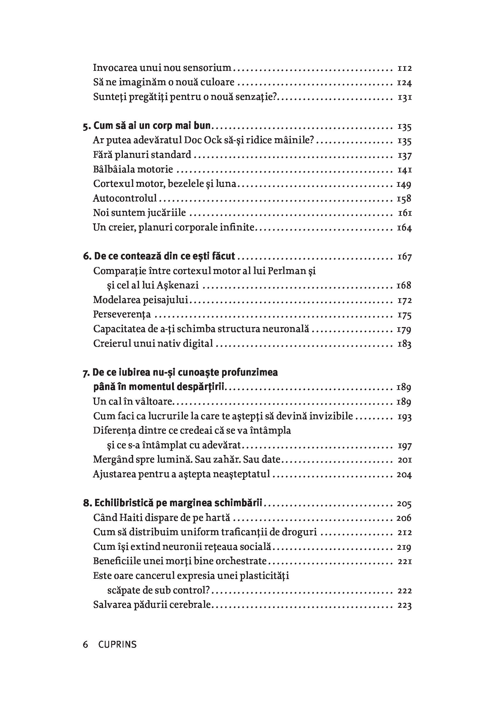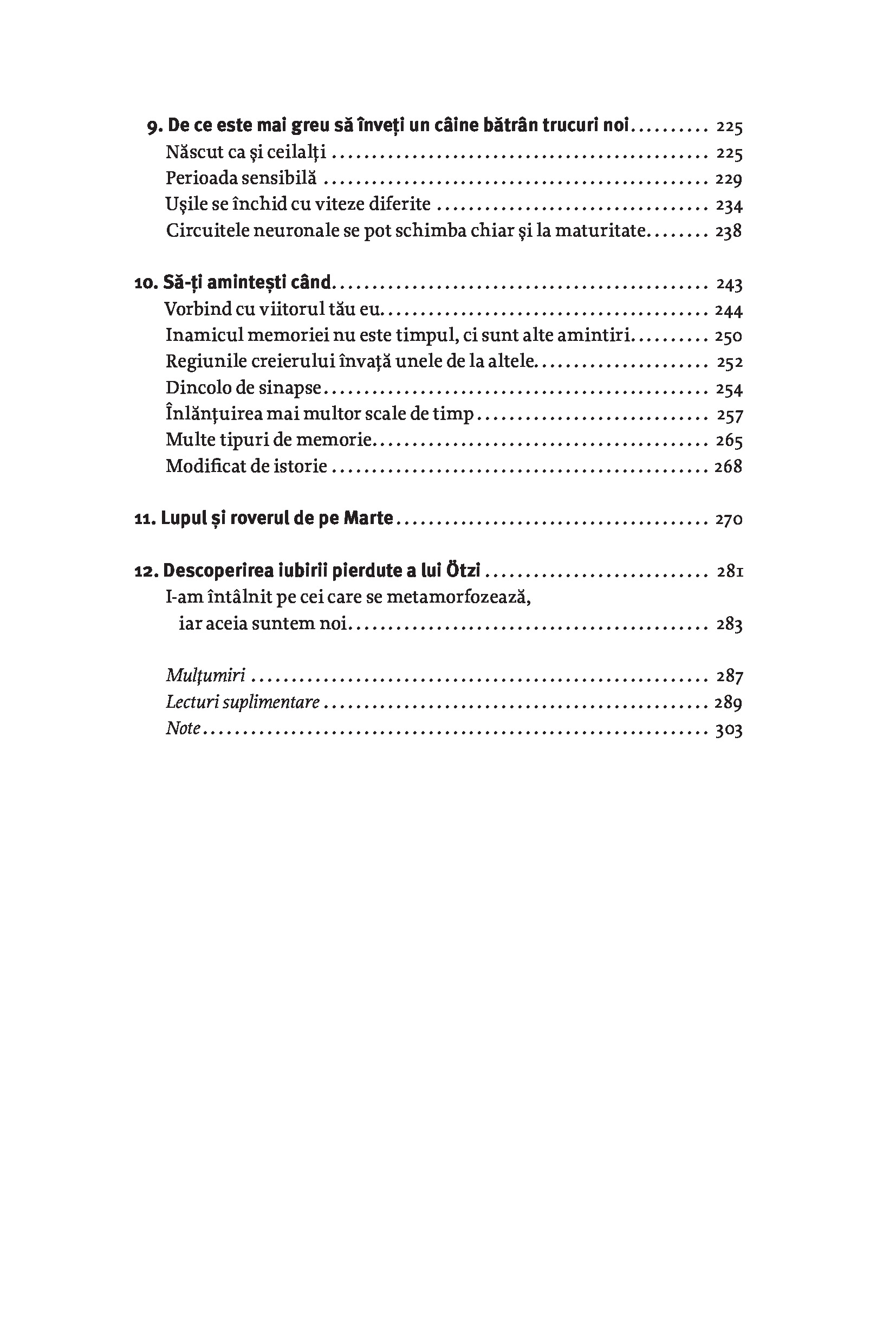 Ce au în comun sevrajul și o inimă frântă? De ce dușmanul memoriei nu este timpul, ci sunt alte amintiri? Cum poate o persoană nevăzătoare să învețe să vadă cu limba sau o persoană surdă să audă cu pielea? De ce, în anii ’80, mulți oameni aveau impresia că paginile cărților sunt vag roșiatice? Cum se face că cel mai bun arcaș din lume nu are brațe? Vom putea, într-o zi, să controlăm un robot doar prin puterea gândurilor, la fel cum ne mișcăm degetele? De ce visăm noaptea și ce legătură are acest lucru cu rotația Pământului?