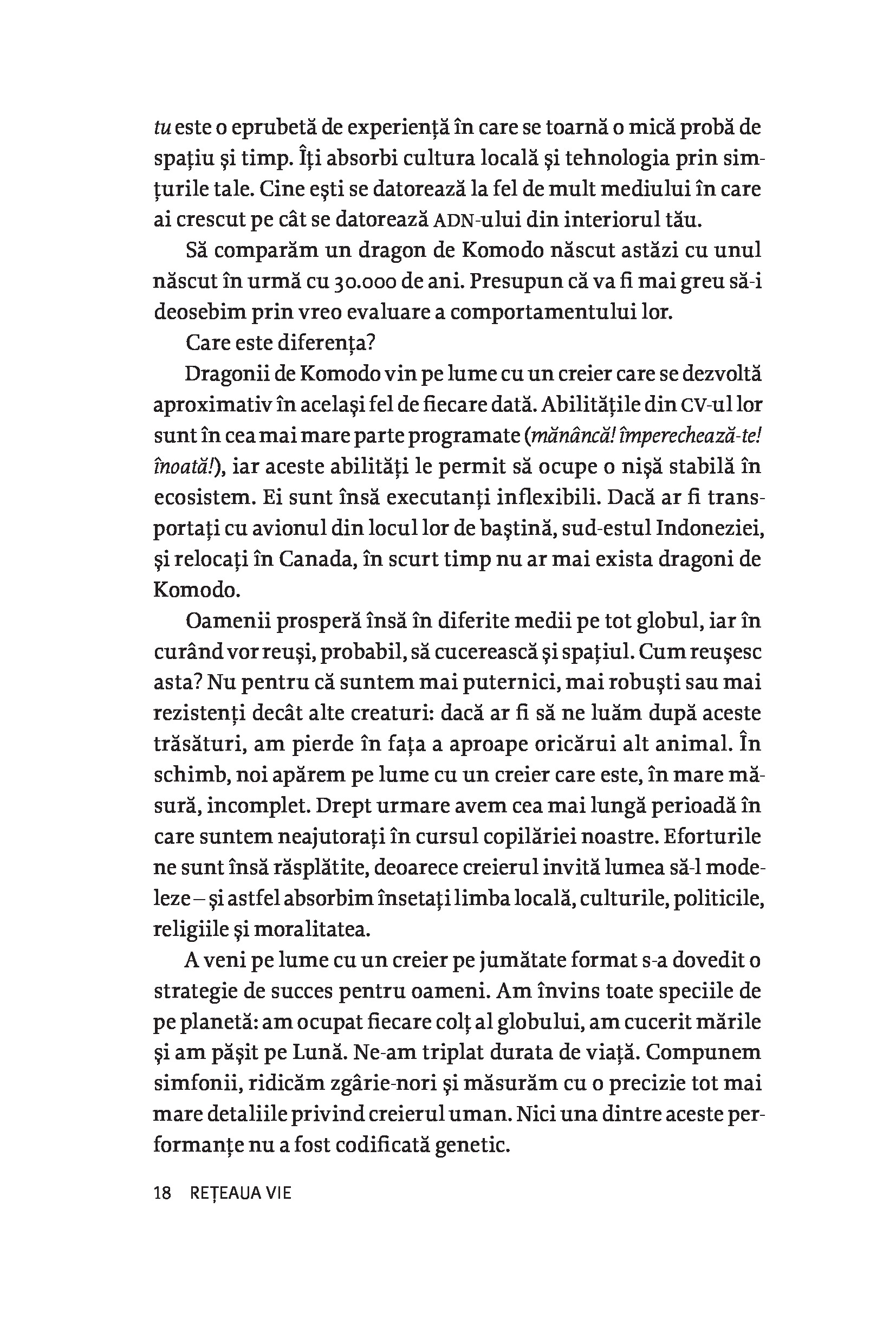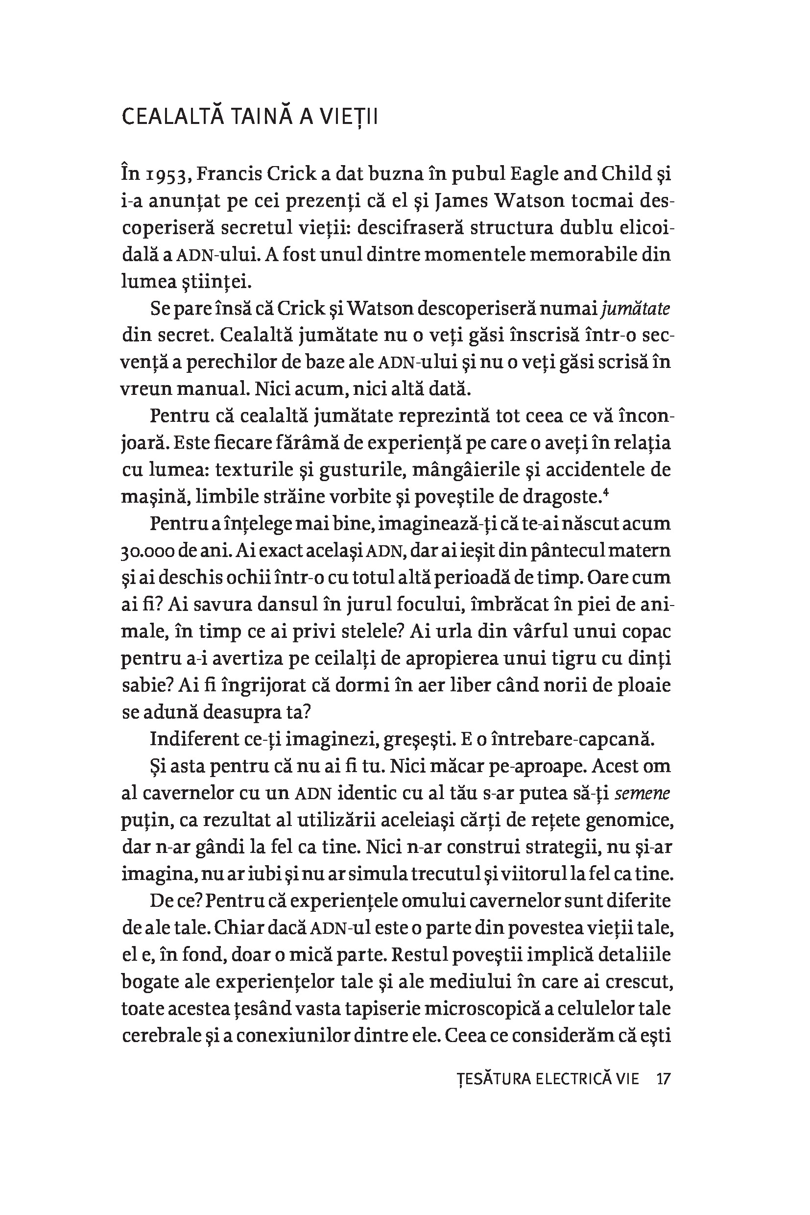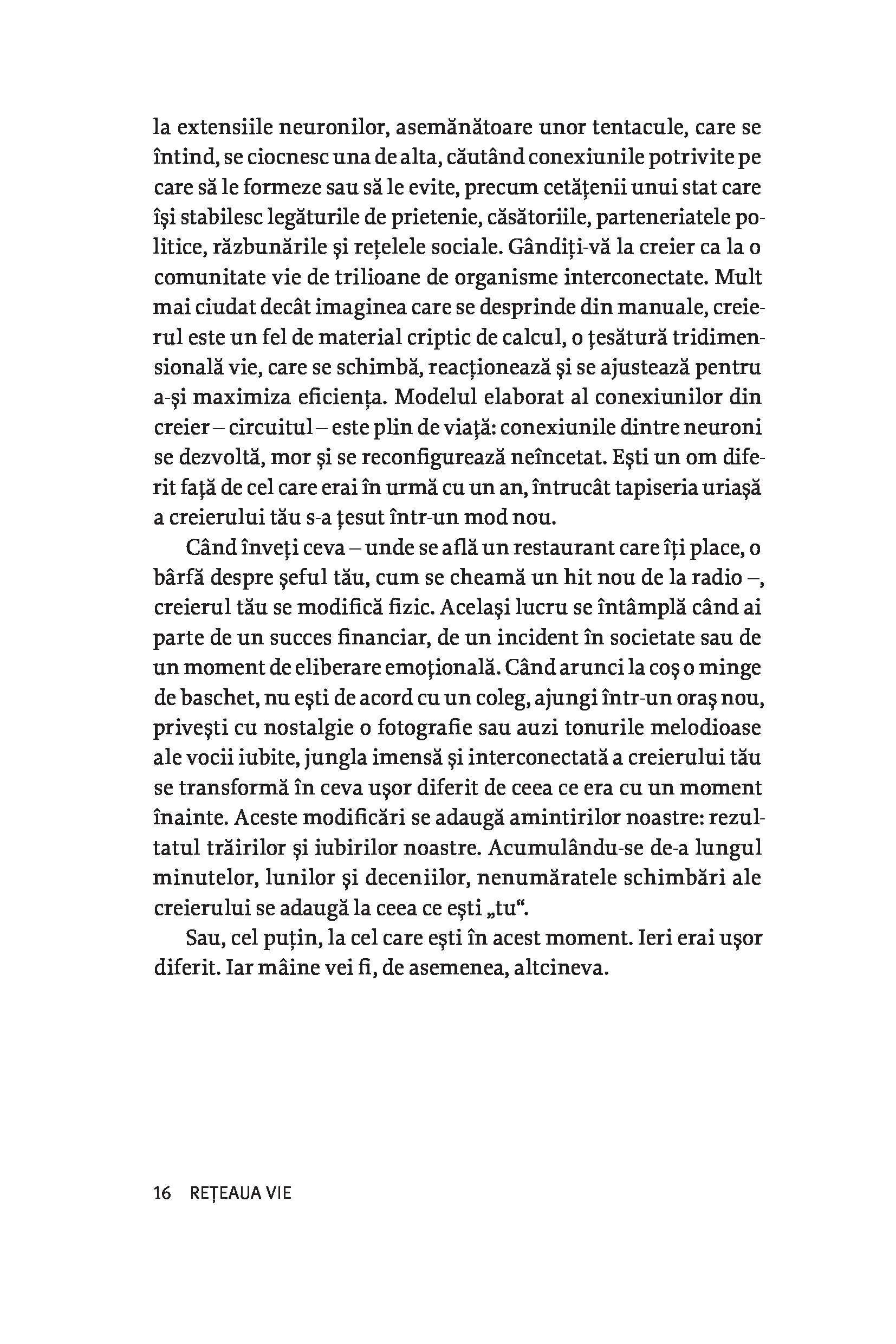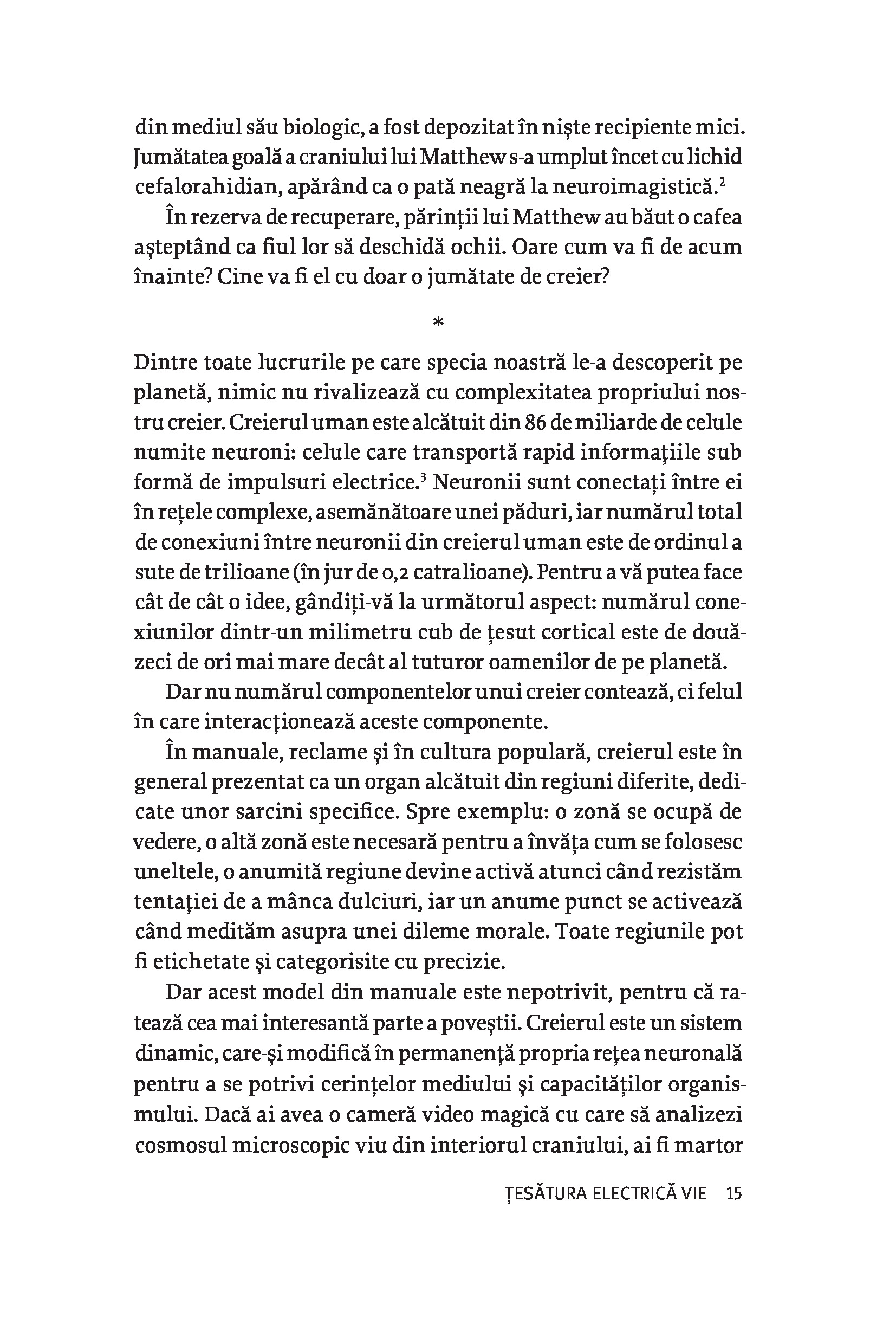 Ce au în comun sevrajul și o inimă frântă? De ce dușmanul memoriei nu este timpul, ci sunt alte amintiri? Cum poate o persoană nevăzătoare să învețe să vadă cu limba sau o persoană surdă să audă cu pielea? De ce, în anii ’80, mulți oameni aveau impresia că paginile cărților sunt vag roșiatice? Cum se face că cel mai bun arcaș din lume nu are brațe? Vom putea, într-o zi, să controlăm un robot doar prin puterea gândurilor, la fel cum ne mișcăm degetele? De ce visăm noaptea și ce legătură are acest lucru cu rotația Pământului?
