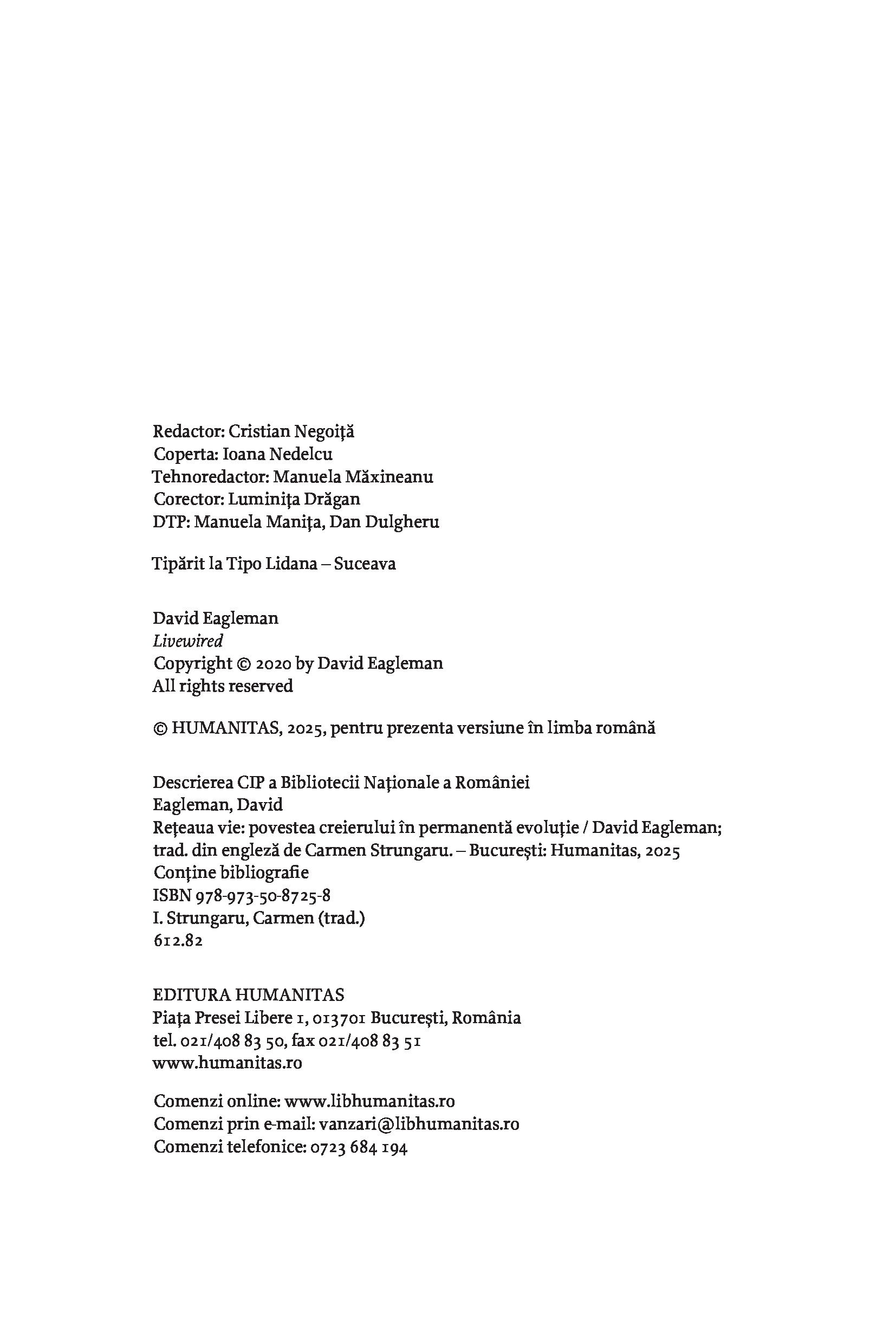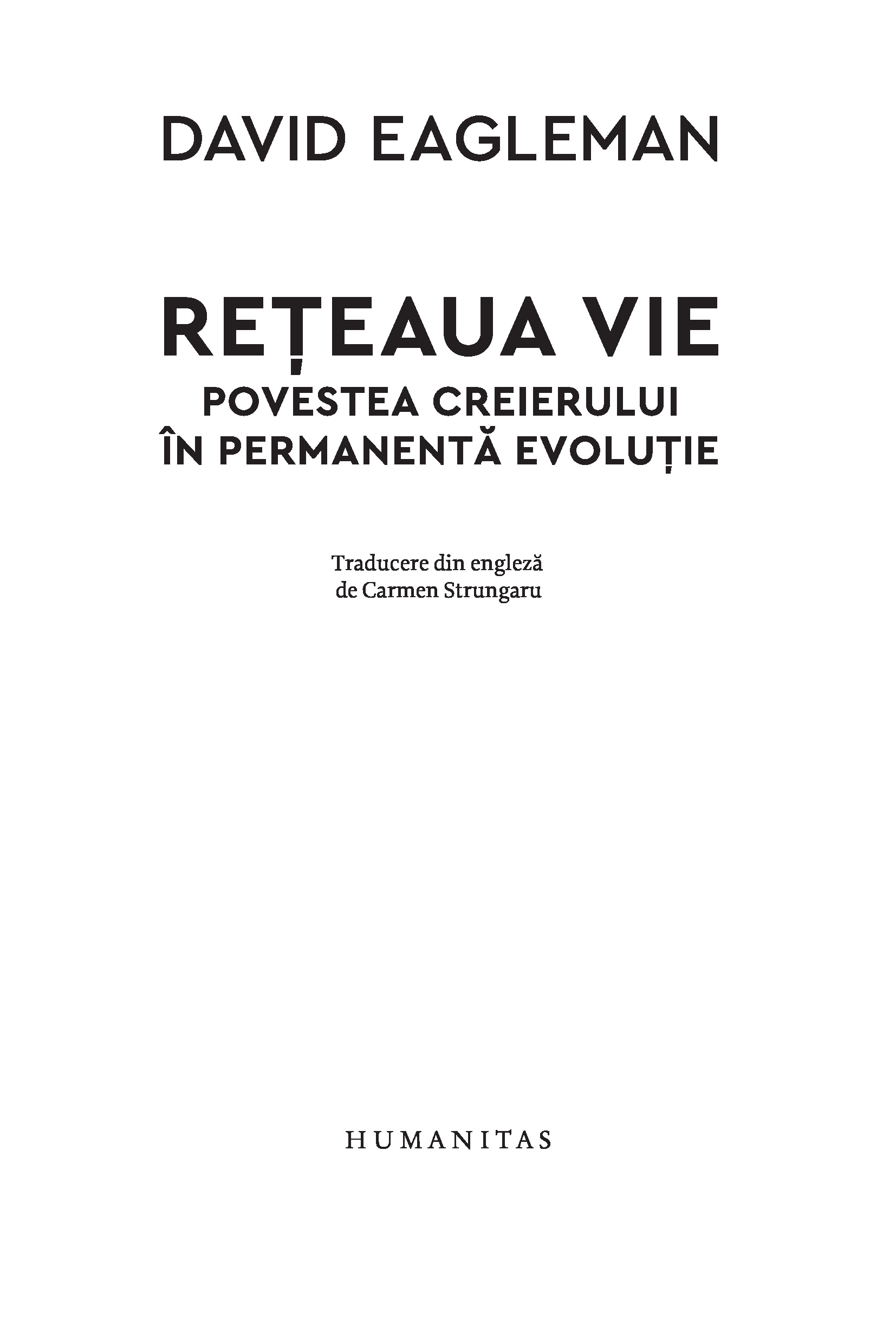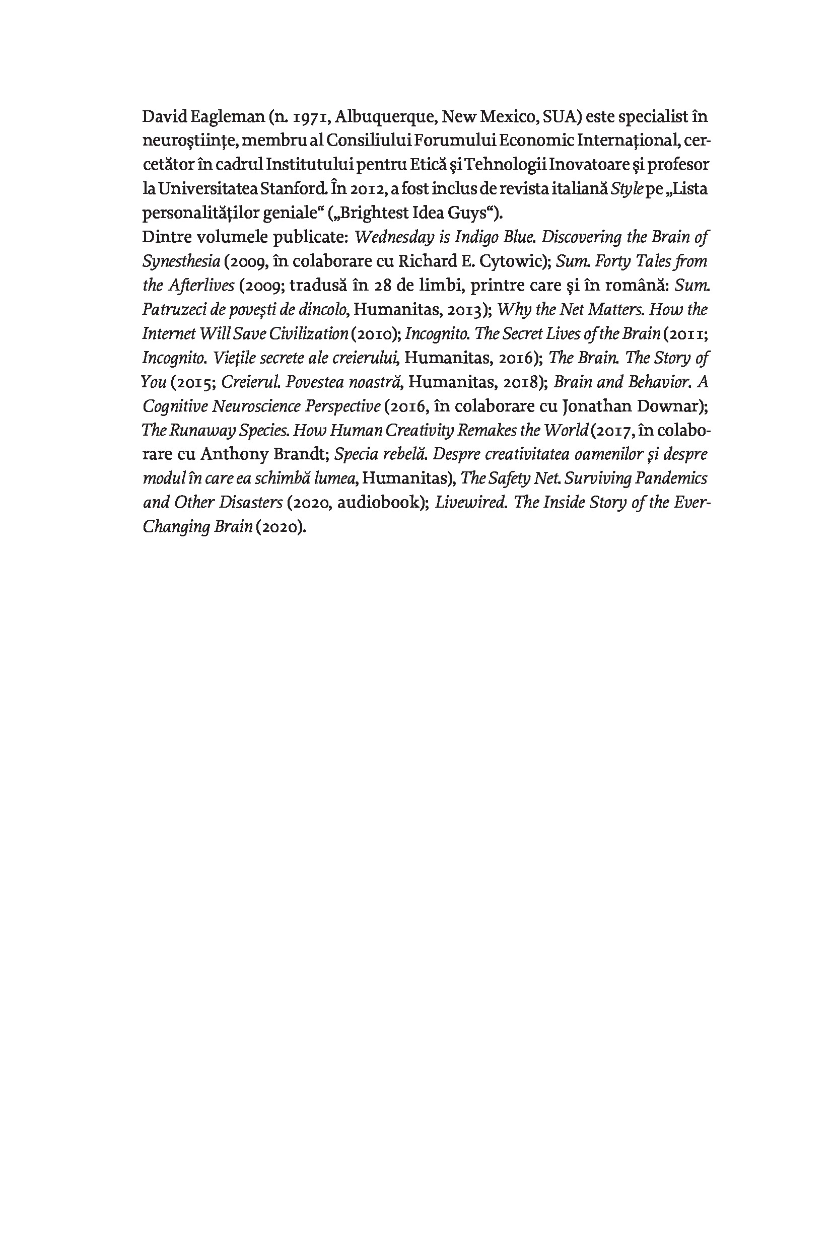 DAVID EAGLEMAN (n. 1971, Albuquerque, New Mexico, SUA) este specialist în neuroştiinţe, membru al Consiliului Forumului Economic Internaţional, cercetător în cadrul Institutului pentru Etică şi Tehnologii Inovatoare şi profesor la Universitatea Stanford. În 2012, a fost inclus de revista italiană Style pe „Lista personalităţilor geniale“ („Brightest Idea Guys“). Dintre volumele publicate: Wednesday is Indigo Blue. Discovering the Brain of Synesthesia (2009, în colaborare cu Richard E. Cytowic); Sum. Forty Tales from the Afterlives (2009; tradusă în 28 de limbi, printre care şi în română: Sum. Patruzeci de poveşti de dincolo, Humanitas, 2013); Why the Net Matters. How the Internet Will Save Civilization (2010); Incognito. The Secret Lives of the Brain (2011; Incognito. Vieţile secrete ale creierului, Humanitas, 2016); The Brain. The Story of You (2015; Creierul. Povestea noastră, Humanitas, 2018); Brain and Behavior. A Cognitive Neuroscience Perspective (2016, în colaborare cu Jonathan Downar); The Runaway Species. How Human Creativity Remakes the World (2017, în colaborare cu Anthony Brandt; Specia rebelă. Despre creativitatea oamenilor și despre modul în care ea schimbă lumea, Humanitas), The Safety Net. Surviving Pandemics and Other Disasters (2020, audiobook); Livewired. The Inside Story of the Ever-Changing Brain (2020).