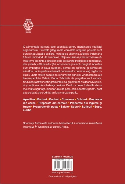 O alimentatie corecta este esentiala pentru mentinerea vitalitatii organismului. Fructele si legumele, cerealele integrale, pestele sint surse inepuizabile de fibre, minerale si vitamine, aflate la indemina tuturor. Imbinindu-le armonios, Retete culinare si sfaturi pentru sanatate va prezinta peste o mie de preparate traditionale romanesti, dar si din bucataria altor tari, economice si simplu de gatit. Acestea sint impartite in doua categorii, pentru cei suferinzi si pentru cei sanatosi, iar in partea adresata persoanelor bolnave veti regasi inclusiv unele retete bazate pe renumitele principii vindecatoare ale bioterapeutului Valeriu Popa. Tehnicile de pregatire sint variate, fiind alese astfel incit ingredientele sa-si pastreze nu doar savoarea, ci si continutul de substante nutritive. Pentru a putea fi identificate cu mai multa usurinta, mincarurile de post, cele adaptate pentru post sau pe baza de cruditati au fost marcate grafic.