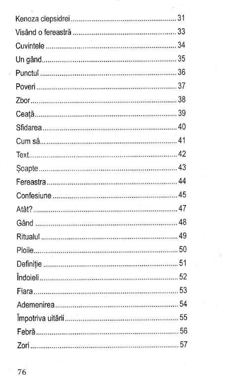 Dezarmantă conştiinţă a deja-spusului, sensibilitate ultragiată şi sfidătoare, timid-agresivă, ironic surpată de melancolii; libertate celebrând încremeniri; preaplin convieţuind cu vidul în registru suprarealist: „deşi sunt, nu exist”; un ochi sălbatec/sălbăticit întors spre „duhorile de veac vlăguit”; sintaxă frântă şi zdrenţuită, în poticniri anume ale vocii; alienat şi ironic, cu o ironie încă încântată de propria semeţie, dar arareori deviată înspre sentimental; nesaţ şi lehamite; coşmaruri de o visceralitate livrescă, brutal-expresivă; un rău-de-viaţă, parţial jucat/trucat, căci dincolo de pojghiţa biciuitoare şi deşucheată a vorbelor sângeră moralistul, duios-sentimentalul, îngăduitorul; exersări ale capacităţii sapienţiale a versului, scrâşnit-metaforice – iată paşii poetului.