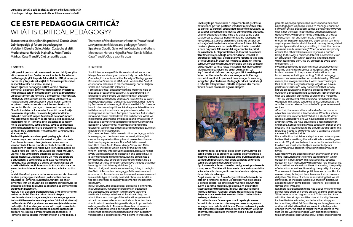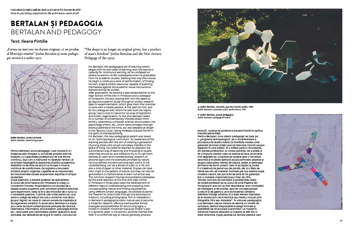 Acest dosar Arta dedicat educației, apare datorită invitației adresate de Marina Oprea, alături de Gabriela Mateescu, și cuprinde majoritatea dilemelor cu care ne-am confruntat pe tot parcursul nostru de artiști pedagogi: de la necesitatea unor certitudini care să dea sens eforturilor noastre, la nevoia raportării la niște cadre teoretice actuale; de la cunoașterea contextului istoric, la înțelegerea celui contemporan; de la idea de spații educaționale la idea de spații de învățare sigure și incluzive; de la blocajul în narativa de ateliere „alternative” și „non-formale”, la programul de lungă durată; de la frica față de o educație suspendată între „edutainement” și „pedagogical aesthetics”, la speranța că arta încă are capacitatea de a inventa „coordonate mutante” și de a genera „calități ale ființei fără precedent”