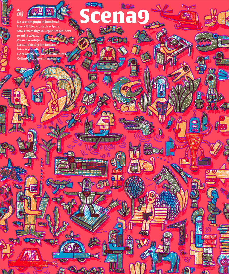 Noi, echipa de jurnaliști de la Scena9, lansăm primul număr tipărit al revistei Scena9, o publicație-eveniment de peste 200 de pagini, în care am adunat câteva zeci de jurnaliști, ilustratori, fotografi, designeri, scriitori, regizori și-am explorat probleme ce țin de educație, justiție, sănătate, artă, religie, filosofie. În paginile revistei Scena9, unii dintre cei mai importanți artiști contemporani români trasează harta culturală a țării și a lumii, așa cum a arătat ea în 2018.