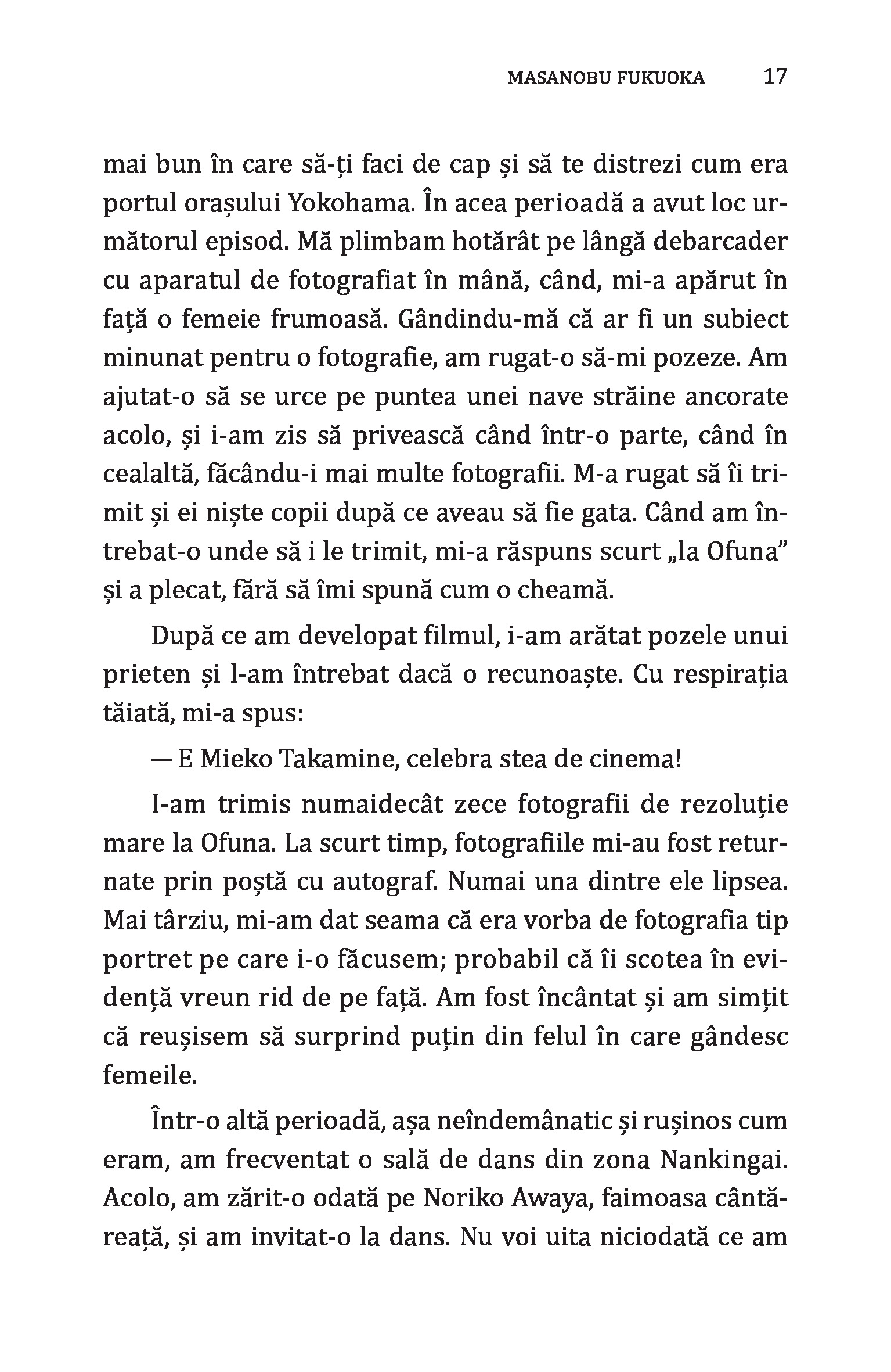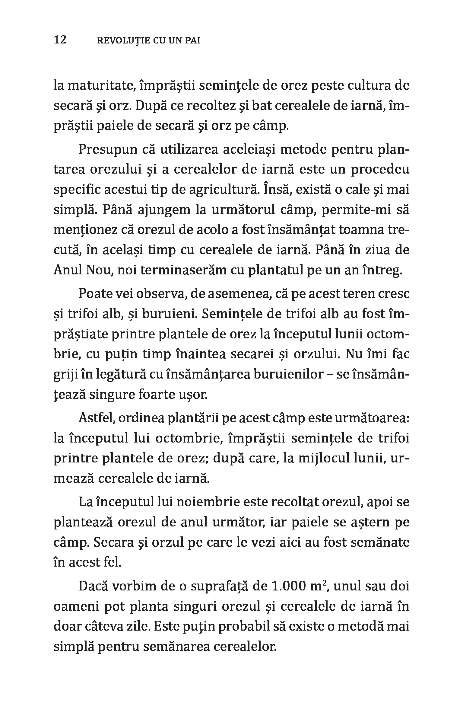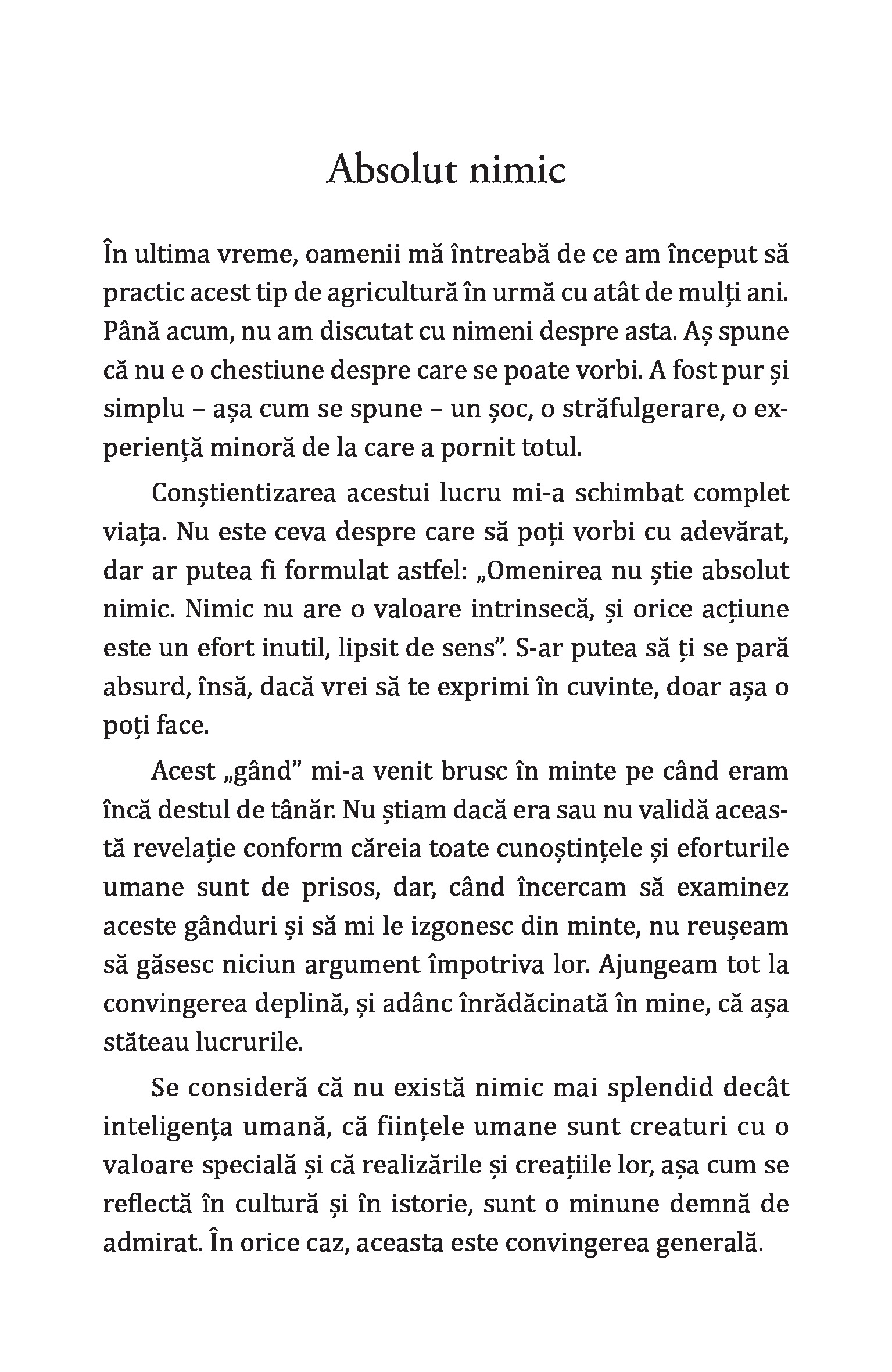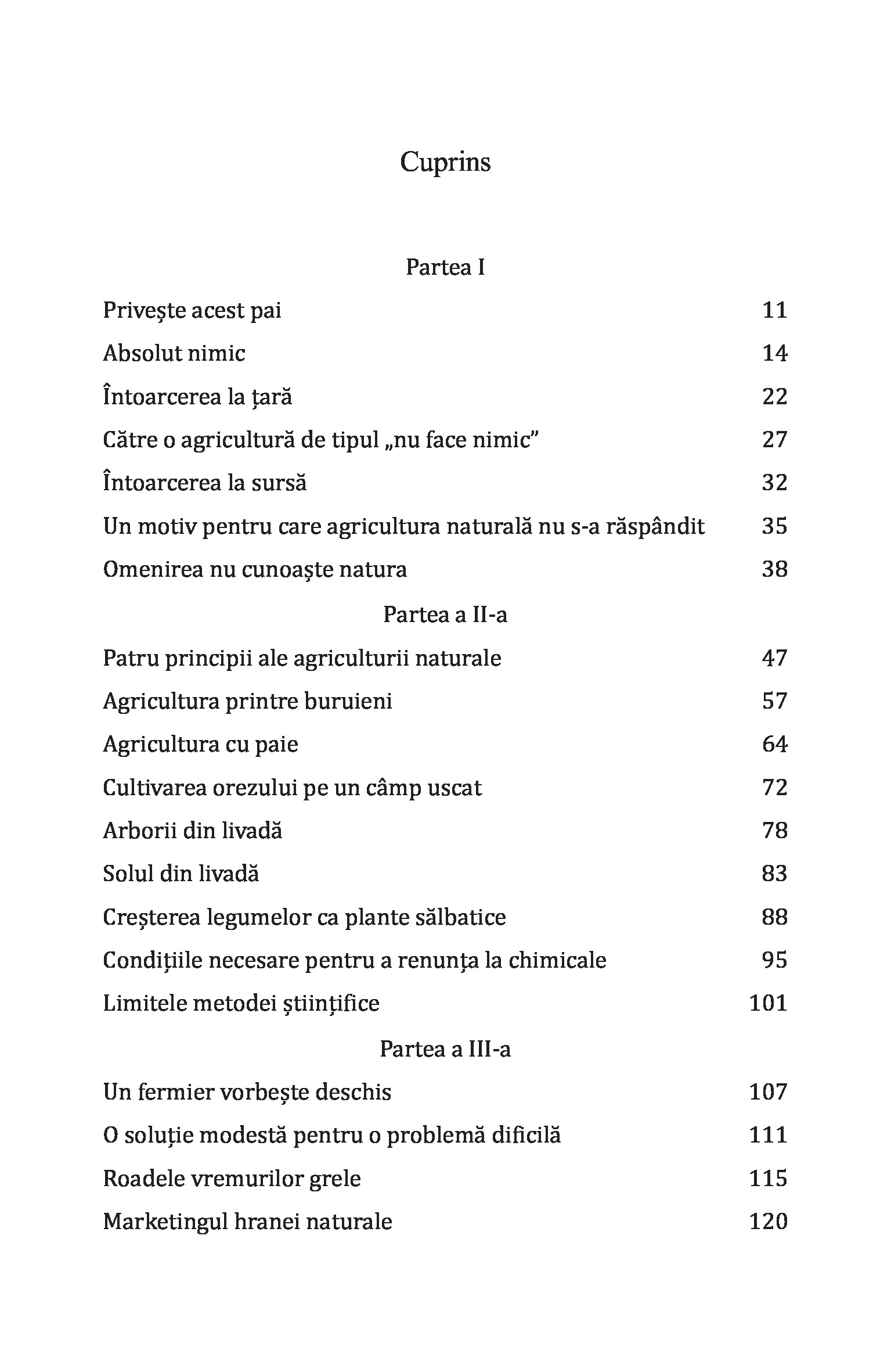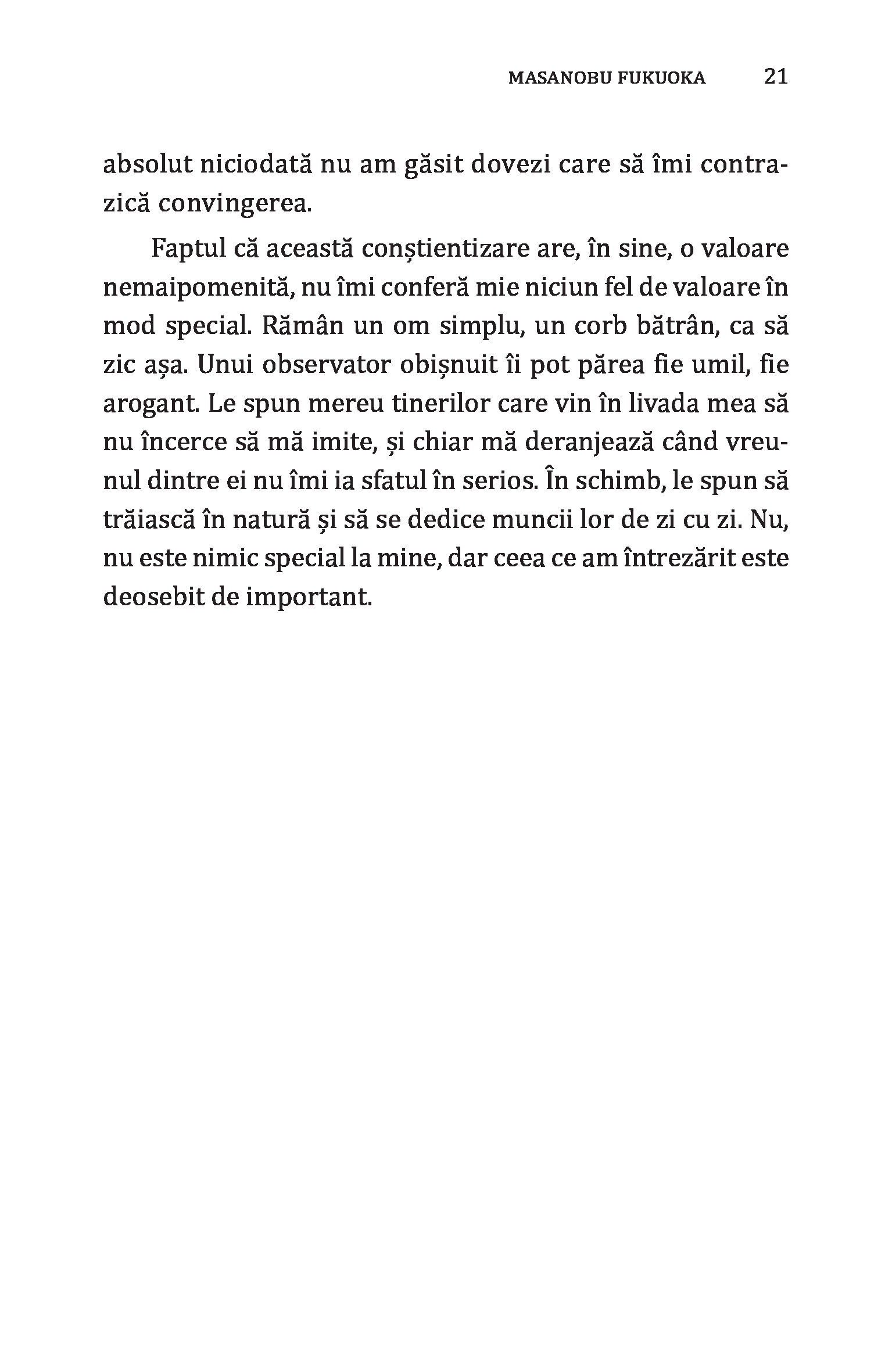 Putând fi numită la fel de bine „Zen și Arta agriculturii” sau „Micuța carte verde”, cartea lui Fukuoka, publicată pentru prima dată în anul 1978, reflectă deopotrivă încrederea profundă a autorului ei în echilibrul lumii naturale, dar și o întreagă filozofie de viață în centrul căreia se află ideea reîntoarcerii la natură. Prin urmare, în concepția lui, cele mai bune forme de agricultură trebuie să oglindească legile naturii.