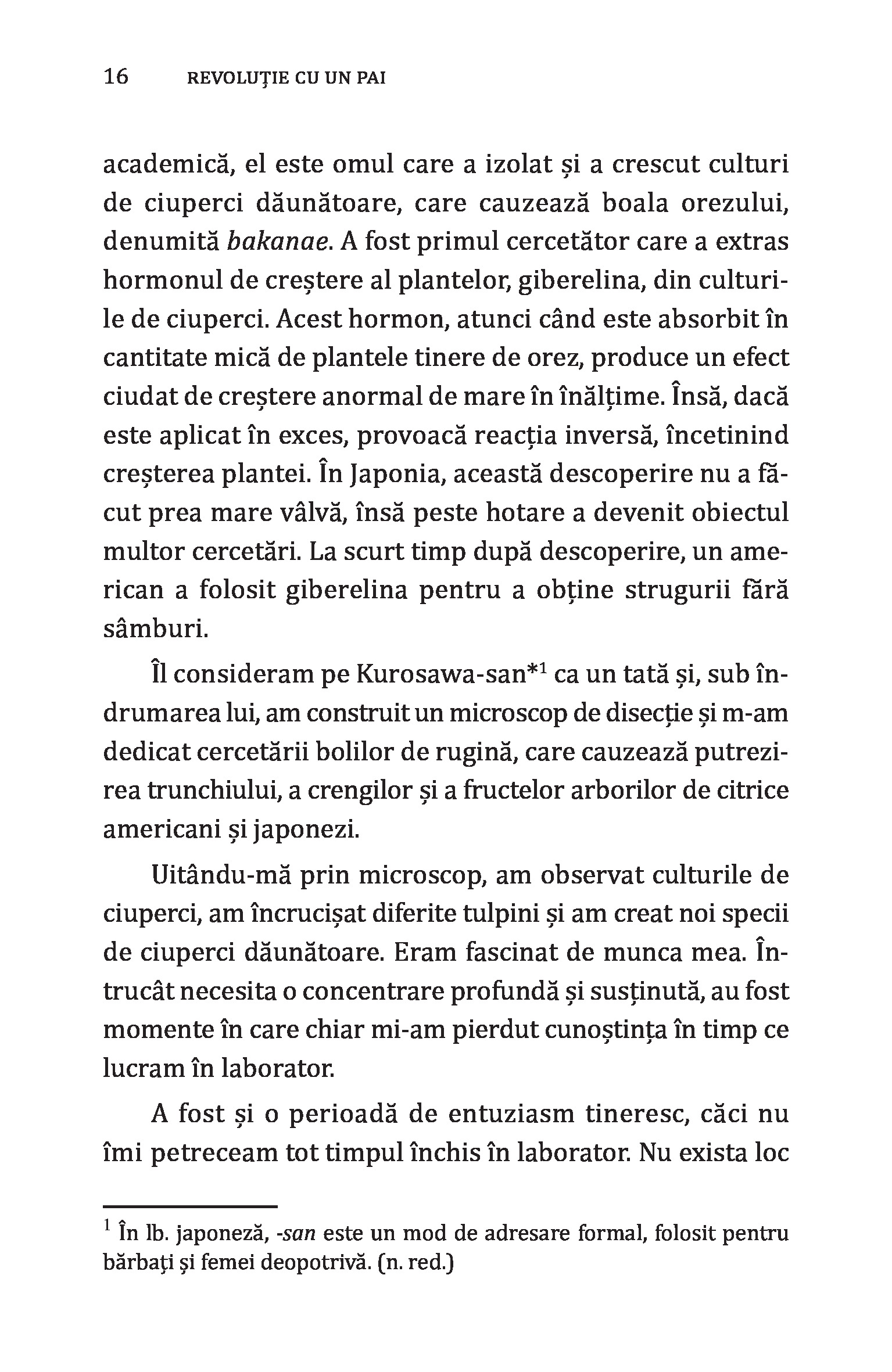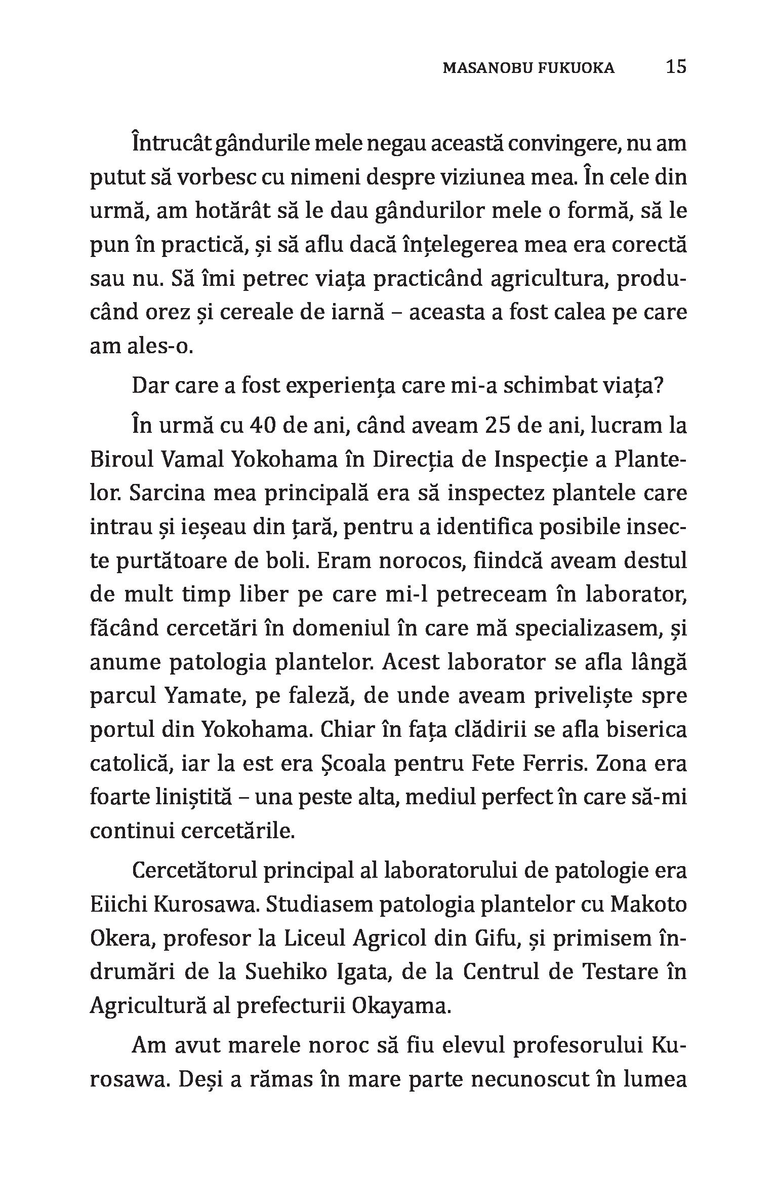 Masanobu Fukuoka (1913 - 2008) s-a specializat în microbiologie la Yokohama, devenind specialist în bolile plantelor. La 25 de ani, în urma unei revelații trăite într-o dimineață, a ajuns la concluzia că „În această lume nu există absolut nimic…”. Apoi și-a dat demisia din postul de cercetător și s-a întors în satul său natal hotărându-se să testeze veridicitatea metodei sale agricole de „a nu face nimic”. Teoria lui era că culturile cresc singure și că oamenii nu ar trebui să intervină. Însă prima lui încercare, pe livada de mandarine a tatălui său, a fost un eșec total, ducând la uscarea completă a acesteia. Cartea de față a fost scrisă la 61 de ani, după ce Fukuoka practicase agricultura naturală timp de mai bine de 30 de ani cu rezultate excepționale. În paginile ei autorul a îmbinat abil ideile sale despre natură și viață cu principiile unei agriculturi naturale bazate pe filosofia de a nu face nimic.