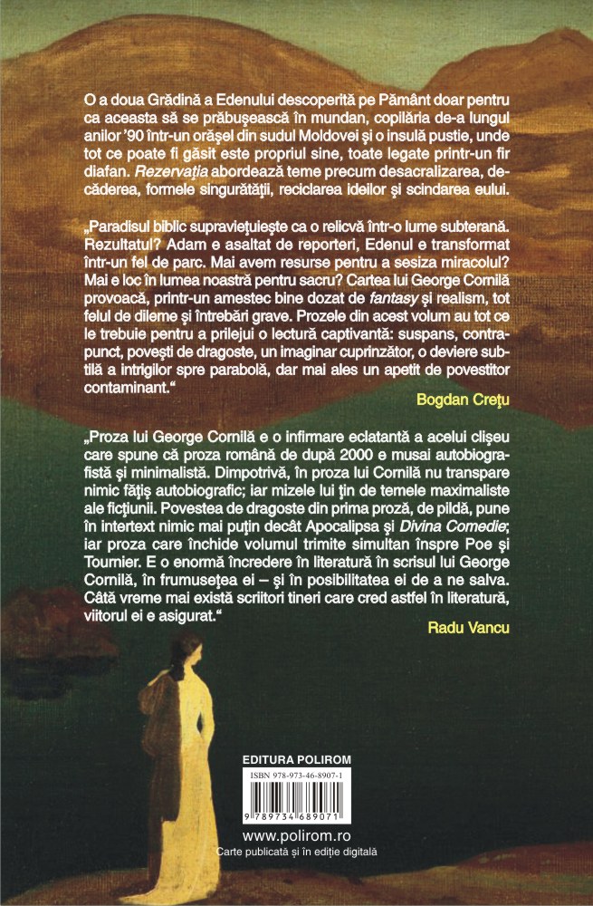 „Paradisul biblic supraviețuiește ca o relicvă într-o lume subterană. Rezultatul? Adam e asaltat de reporteri, Edenul e transformat într-un fel de parc. Mai avem resurse pentru a sesiza miracolul? Mai e loc în lumea noastră pentru sacru? Cartea lui George Cornilă provoacă, printr-un amestec bine dozat de fantasy și realism, tot felul de dileme și întrebări grave. Prozele din acest volum au tot ce le trebuie pentru a prilejui o lectură captivantă: suspans, contra-punct, povești de dragoste, un imaginar cuprinzător, o deviere subtilă a intrigilor spre parabolă, dar mai ales un apetit de povestitor contaminant.” (Bogdan Crețu)