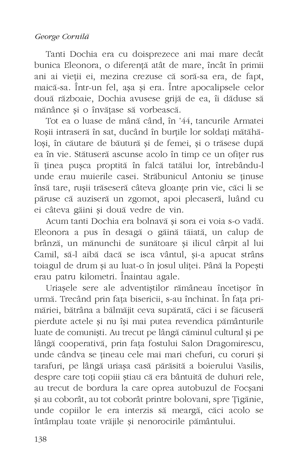 „Proza lui George Cornilă e o infirmare eclatantă a acelui clișeu care spune că proza română de după 2000 e musai autobiografistă și minimalistă. Dimpotrivă, în proza lui Cornilă nu transpare nimic fățiș autobiografic; iar mizele lui țin de temele maximaliste ale ficțiunii. Povestea de dragoste din prima proză, de pildă, pune în intertext nimic mai puțin decât Apocalipsa și Divina Comedie; iar proza care închide volumul trimite simultan înspre Poe și Tournier. E o enormă încredere în literatură în scrisul lui George Cornilă, în frumusețea ei – și în posibilitatea ei de a ne salva. Câtă vreme mai există scriitori tineri care cred astfel în literatură, viitorul ei e asigurat.” (Radu Vancu)