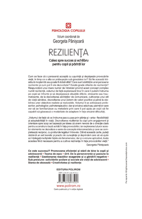 Cum se face că o persoană acceptă cu ușurință și depășește provocările vieții, în timp ce o alta se prăbușește sub greutatea lor? Să fie această trăsătură moștenită sau poate fi dobândită? Care sunt abilitățile unei persoane reziliente și cum pot fi ele dezvoltate? Există grade diferite de reziliență? Răspunzând unui mare număr de întrebări privind acest concept complex numit reziliență, volumul de față explorează felul în care îi putem îndruma pe copii să înfrunte și să depășească situațiile dificile, stresante sau traumatizante, de la dezvoltarea abilităților de comunicare, cultivarea unui stil de viață sănătos, dezvoltarea unui sistem de valori pozitive și până la stabilirea unor obiective realiste și realizabile. Volumul li se adresează profesorilor, psihologilor, psihoterapeuților, dar și oricărui adult sau părinților care vor să se familiarizeze cu metodele prin care îi pot ajuta pe copii să fie capabili să găsească o modalitate de adaptare în fața oricărei dificultăți.