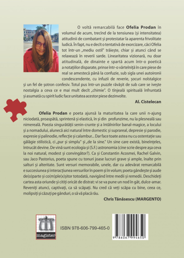 O voltă remarcabilă face Ofelia Prodan în volumul de acum, trecînd de la tensiunea (și intensitatea) atitudinii de combatant și protestatar la aparenta frivolitate ludică. În fapt, nu e decît o tentativă de exorcizare, căci Ofelia tot într-un „mediu ostil” trăiește, chiar și atunci când se relaxează în reverii sarde. Linearitatea vizionară, nu doar atitudinală, de dinainte e spartă acum într-o poetică a notațiilor disparate, prinse într-o vârtelniță în care piese de real se amestecă până la confuzie, sub sigla unei autoironii condescendente, cu infuzii de reverie, șocuri nolstalgice și un fel de șotron confesiv. Totul pus într-un puzzle răvășit de sub care se ivește nostalgia a ceva ce e mai mult decît „chimie”. O tînjeală spirituală înfruntată și asumată cu spirit ludic face unitatea acestor piese dezinvolte. (Al. Cistelecan )