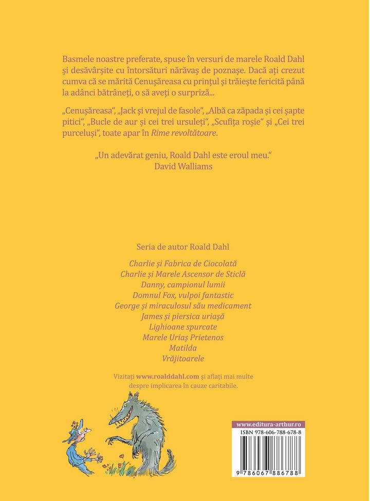 Basmele noastre preferate, spuse în versuri de marele Roald Dahl și desăvârșite cu întorsături nărăvaș de poznașe. Dacă ați crezut cumva că Cenușăreasa se mărită cu prințul și trăiește fericită până la adânci bătrâneți, o să aveți o surpriză...