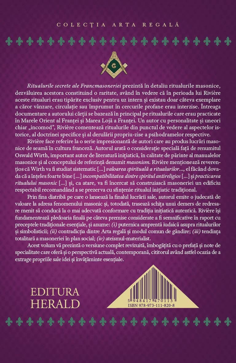 Ritualurile secrete ale Francmasoneriei prezinta in detaliu ritualurile masonice, dezvaluirea acestora constituind o raritate, avand in vedere ca in perioada lui Rivière aceste ritualuri erau tiparite exclusiv pentru uz intern si existau doar cateva exemplare a caror vanzare, circulatie sau imprumut in cercurile profane erau interzise. Intreaga documentare a autorului cartii se bazeaza in principal pe ritualurile care erau practicate in Marele Orient al Frantei si Marea Loja a Frantei. Un autor cu personalitate si uneori chiar „incomod”, Rivière comenteaza ritualurile din punctul de vedere al aspectelor istorice, al doctrinei specifice si al derularii propriu-zise a psihodramelor respective.