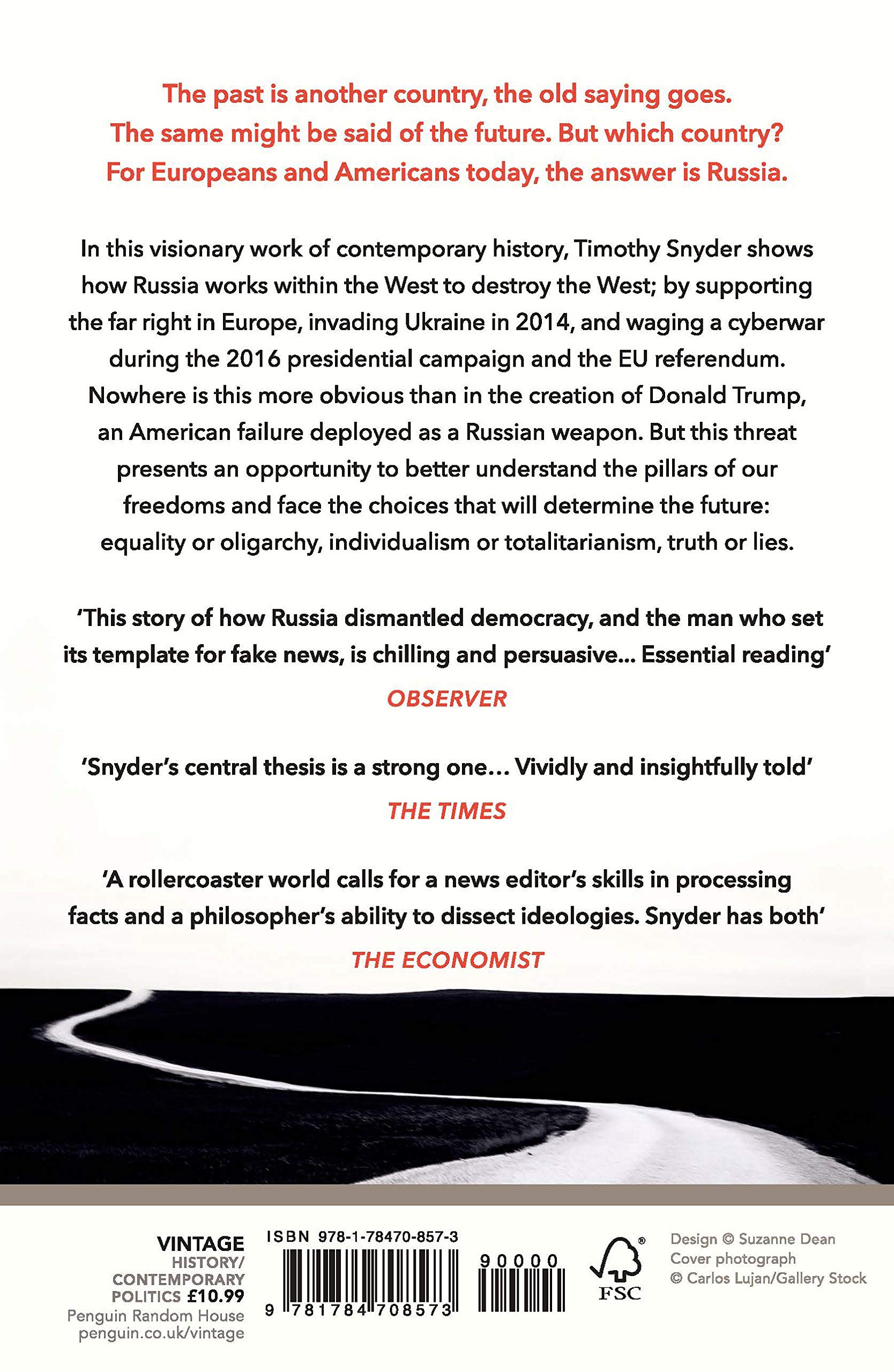 In this visionary work of contemporary history, Timothy Snyder shows how Russia works within the West to destroy the West; by supporting the far right in Europe, invading Ukraine in 2014, and waging a cyberwar during the 2016 presidential campaign and the EU referendum. Nowhere is this more obvious than in the creation of Donald Trump, an American failure deployed as a Russian weapon. But this threat presents an opportunity to better understand the pillars of our freedoms and face the choices that will determine the future: equality or oligarchy, individualism or totalitarianism, truth or lies.