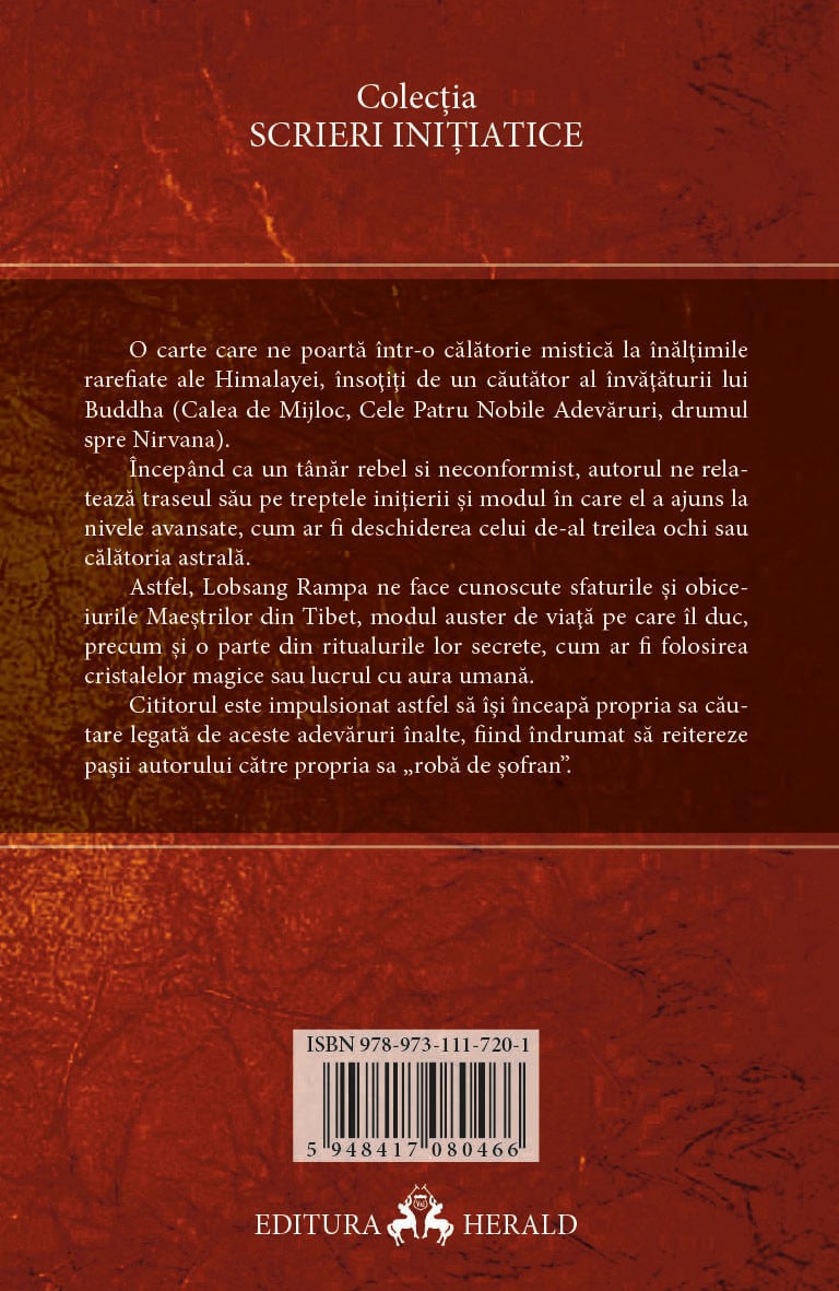 O viata consacrata experientelor mistice! O carte care istoriseste aventurile unui mare calator in astral. Lobsang Rampa a studiat inca din tinerete arta de a calatori in afara corpului fizic. A inteles de timpuriu ca lumea pe care o vedem nu cuprinde tot ceea ce exista. El si-a extins vederea asupra universului care nu cunoaste granite. Autorul ne face cunoscute sfaturile Maestrilor sai din Tibet, care l-au invatat cum sa cerceteze toate aspectele mistice, sa foloseasca cristalele magice si sa citeasca aura umana. Cartea aceasta ne dezvaluie totodata semnificatia robei sofranii, precum si modul de viata si obiceiurile calugarilor de pe Acoperisul Lumii.