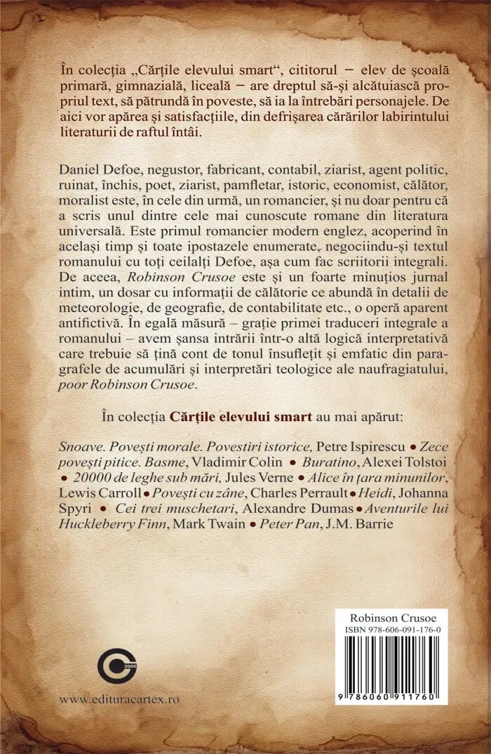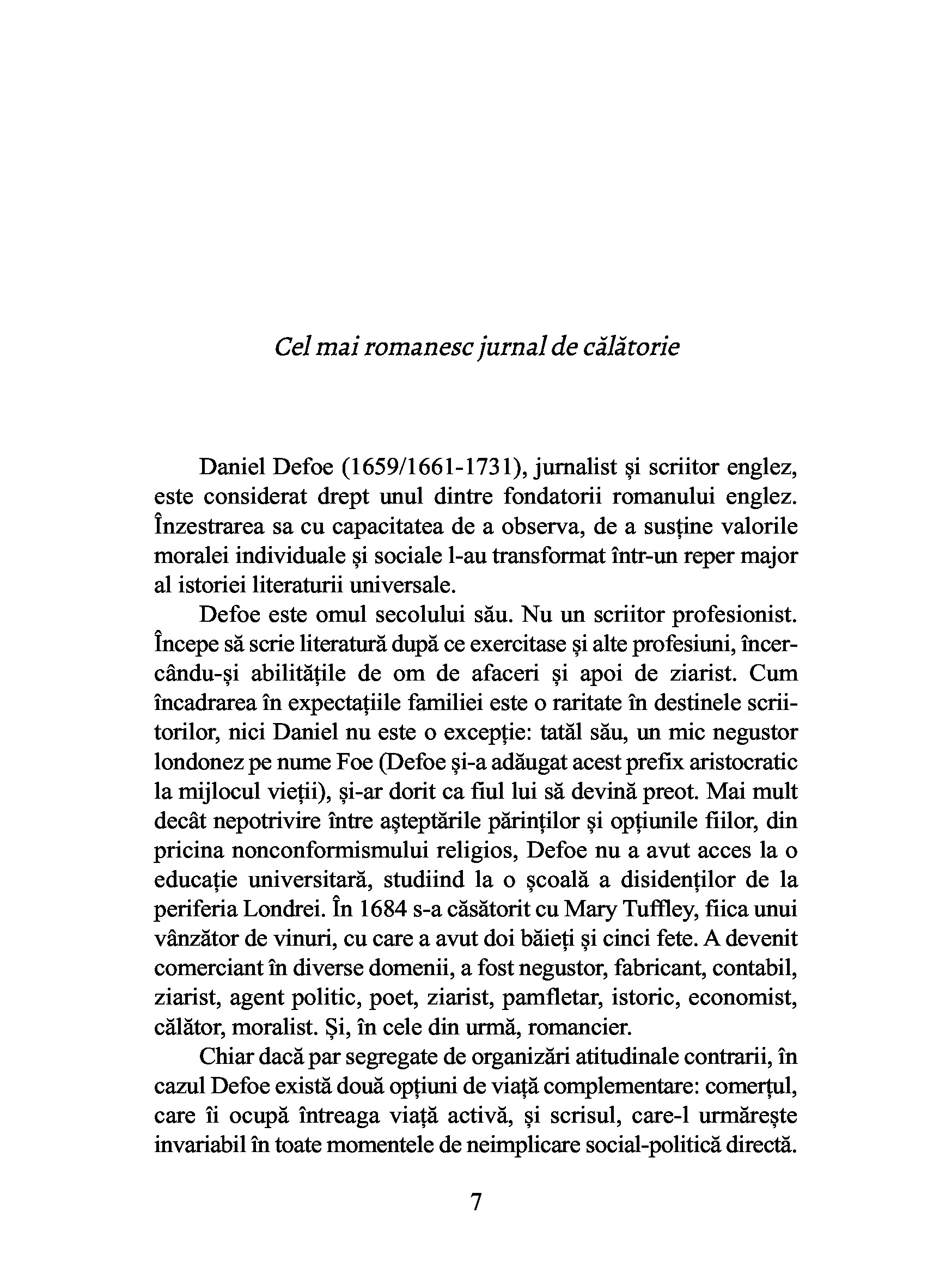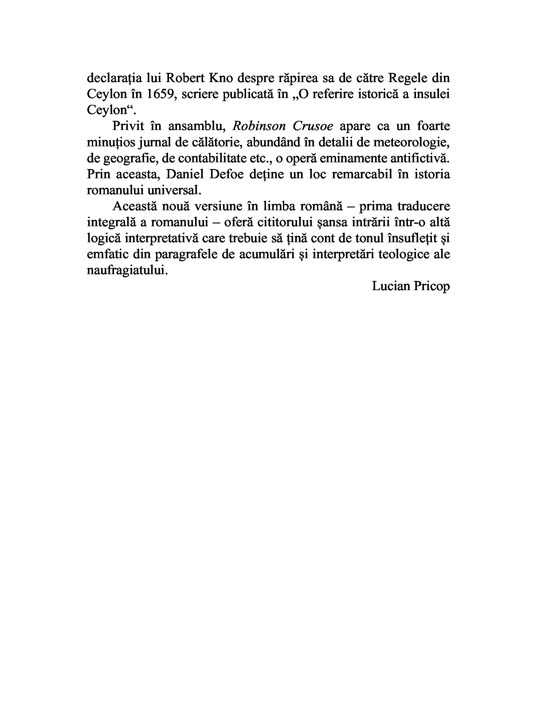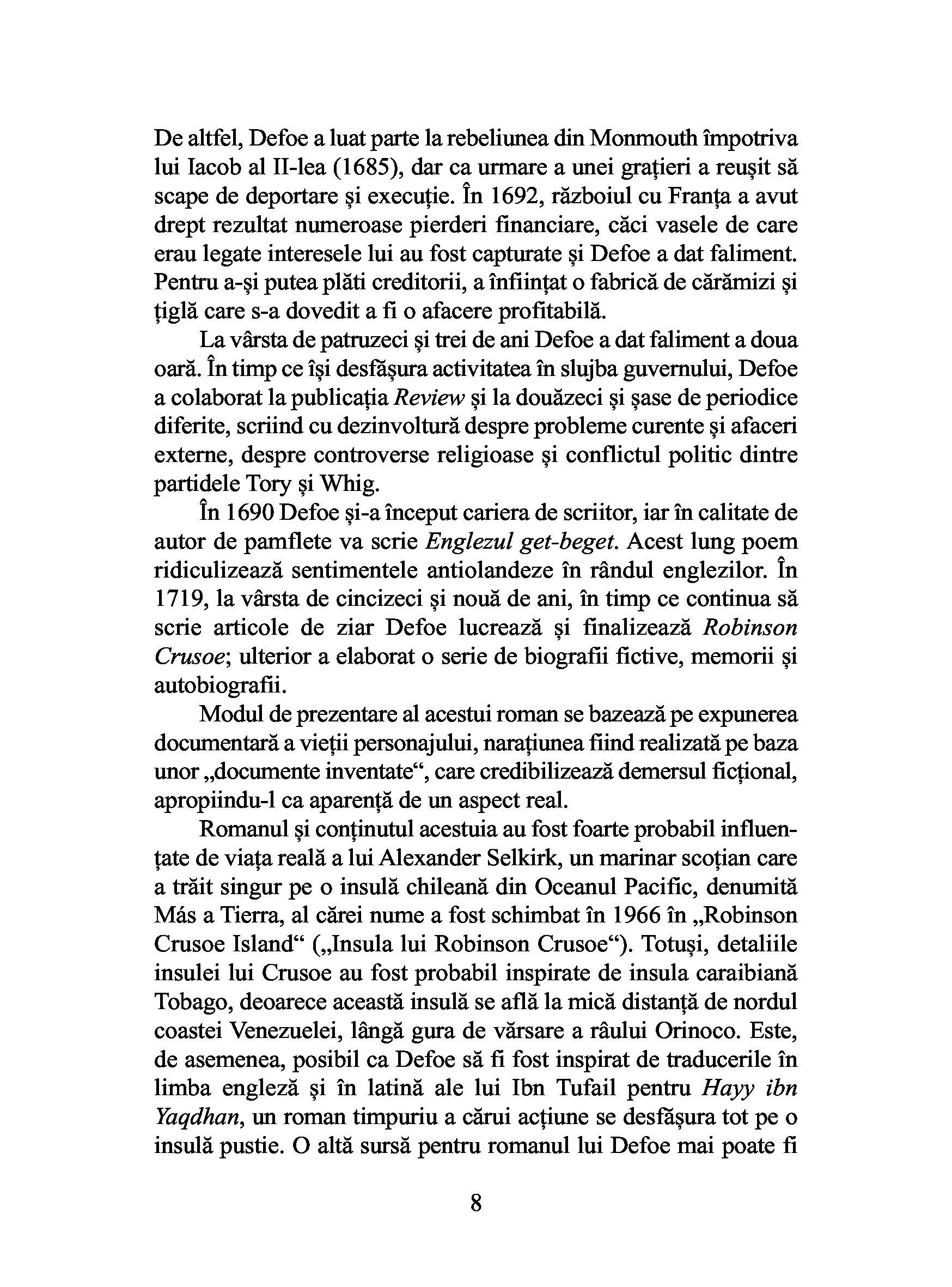Daniel Defoe, negustor, fabricant, contabil, ziarist, agent politic, ruinat, inchis, poet, ziarist, pamfletar, istoric, economist, calator, moralist este, in cele din urma, un romancier, si nu doar pentru ca a scris unul dintre cele mai cunoscute romane din literatura universala. Este primul romancier modern englez, acoperind in acelasi timp si toate ipostazele enumerate, negociindu-si textul romanului cu toti ceilalti Defoe, asa cum fac scriitorii integrali.