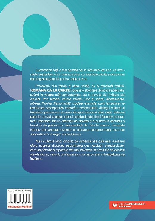Proiectată sub forma a șase unități, cu o structură stabilă, ROMÂNA CA LA CARTE propune o abordare didactică adecvată, având în vedere atât competențele, cât și nevoile de învățare ale elevilor. Prin temele literare tratate (Joc și joacă, Adolescența, Iubirea, Familia, Personalități, modele, exemple, Lumi fantastice) se urmărește descoperirea treptată a conținuturilor, dialogul cultural și transferul permanent al ideilor dinspre literatură spre viață.