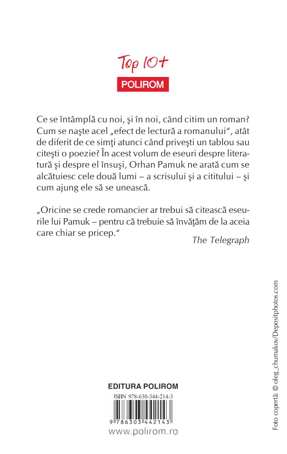 Ce se întâmplă cu noi, şi în noi, când citim un roman? Cum se naşte acel „efect de lectură a romanului”, atât de diferit de ce simţi atunci când priveşti un tablou sau citeşti o poezie? În acest volum de eseuri despre literatură şi despre el însuşi, Orhan Pamuk ne arată cum se alcătuiesc cele două lumi – a scrisului şi a cititului – şi cum ajung ele să se unească.