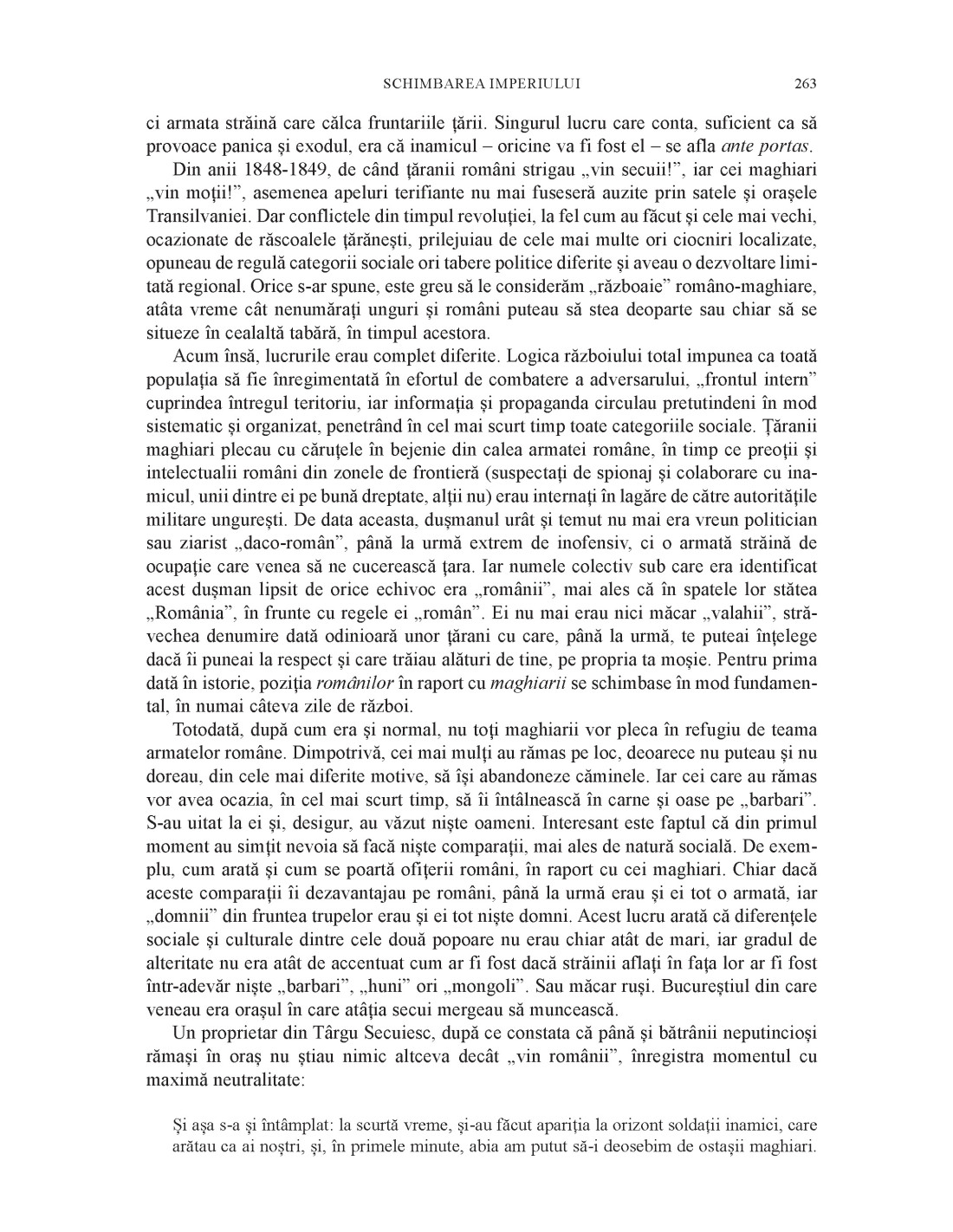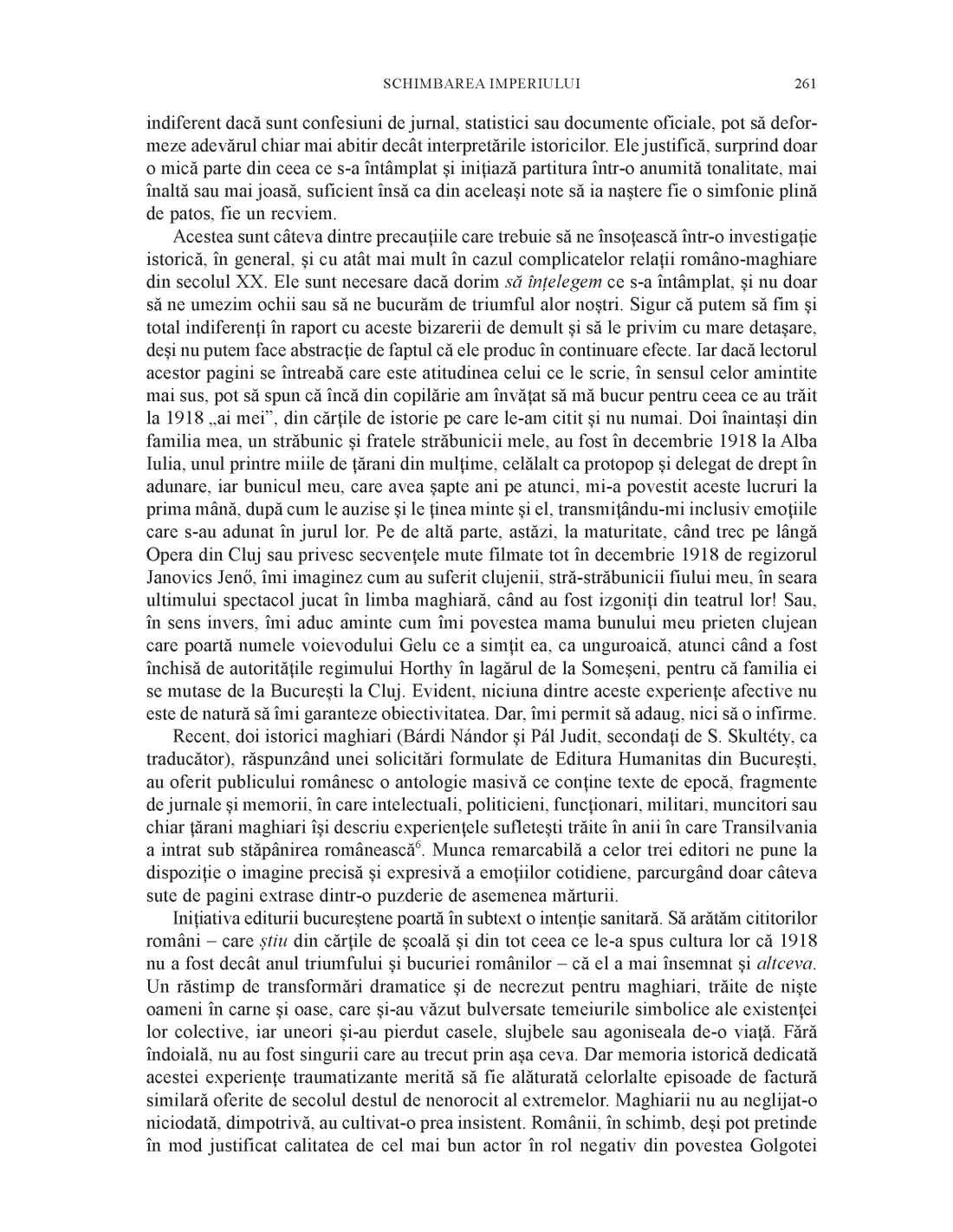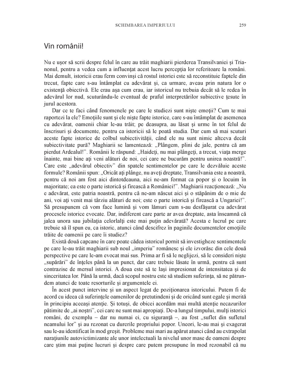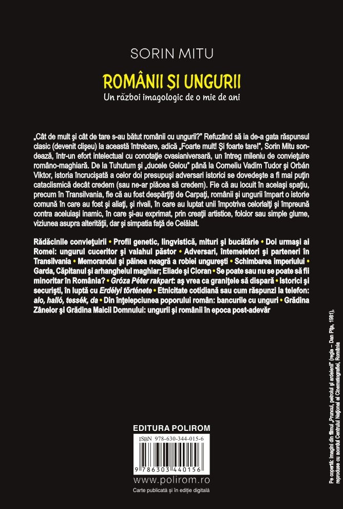„Cât de mult şi cât de tare s-au bătut românii cu ungurii?” Refuzând să ia de-a gata răspunsul clasic (devenit clişeu) la această întrebare, adică „Foarte mult! Şi foarte tare!”, Sorin Mitu sondează, într-un efort intelectual cu conotaţie cvasianiversară, un întreg mileniu de convieţuire româno-maghiară. De la Tuhutum şi „ducele Gelou” până la Corneliu Vadim Tudor şi Orbán Viktor, istoria încrucişată a celor doi presupuşi adversari istorici se dovedeşte a fi mai puţin cataclismică decât credem (sau ne-ar plăcea să credem). Fie că au locuit în acelaşi spaţiu, precum în Transilvania, fie că au fost despărţiţi de Carpaţi, românii şi ungurii împart o istorie comună în care au fost şi aliaţi, şi rivali, în care au luptat unii împotriva celorlalţi şi împreună contra aceluiaşi inamic, în care şi-au exprimat, prin creaţii artistice, folclor sau simple glume, viziunea asupra alterităţii, dar şi simpatia faţă de Celălalt.
