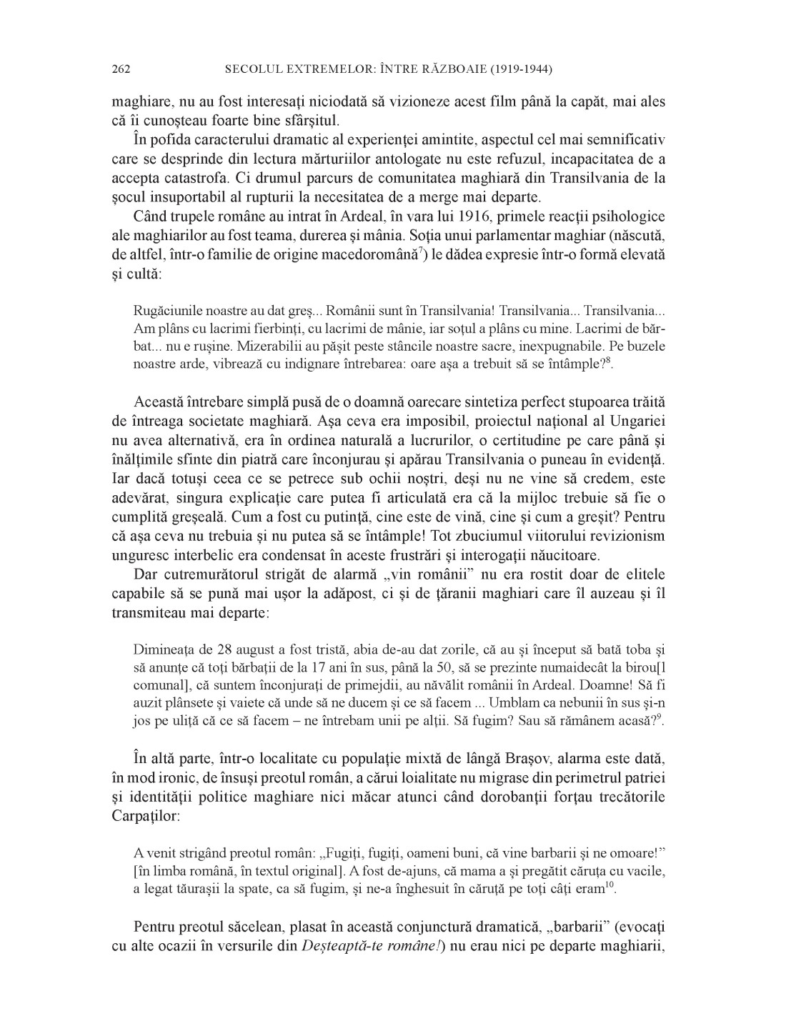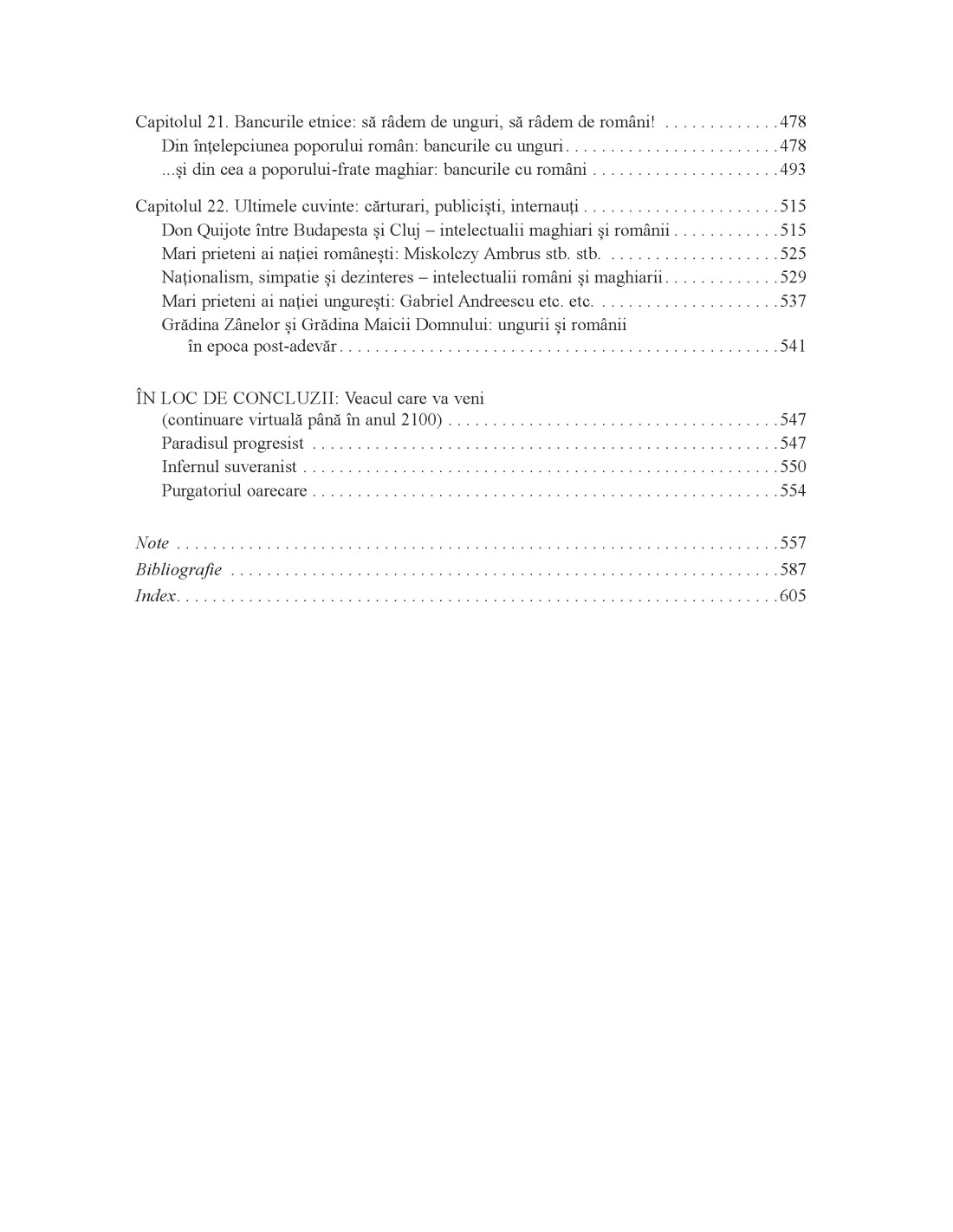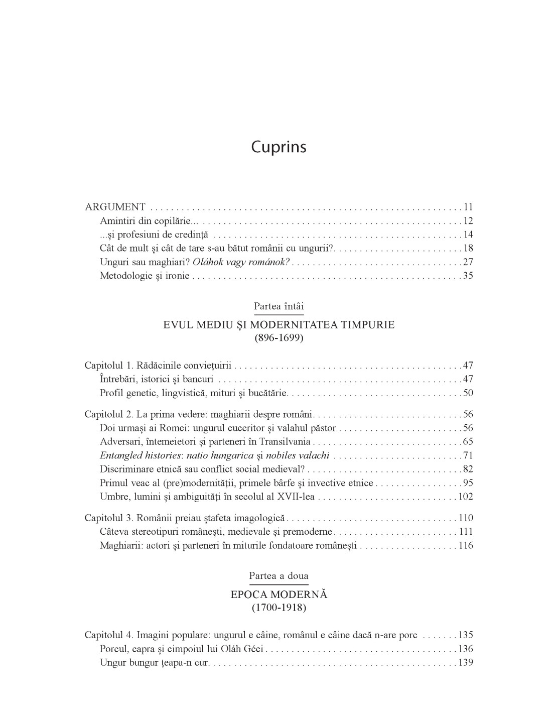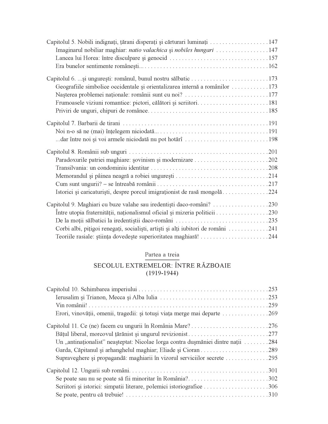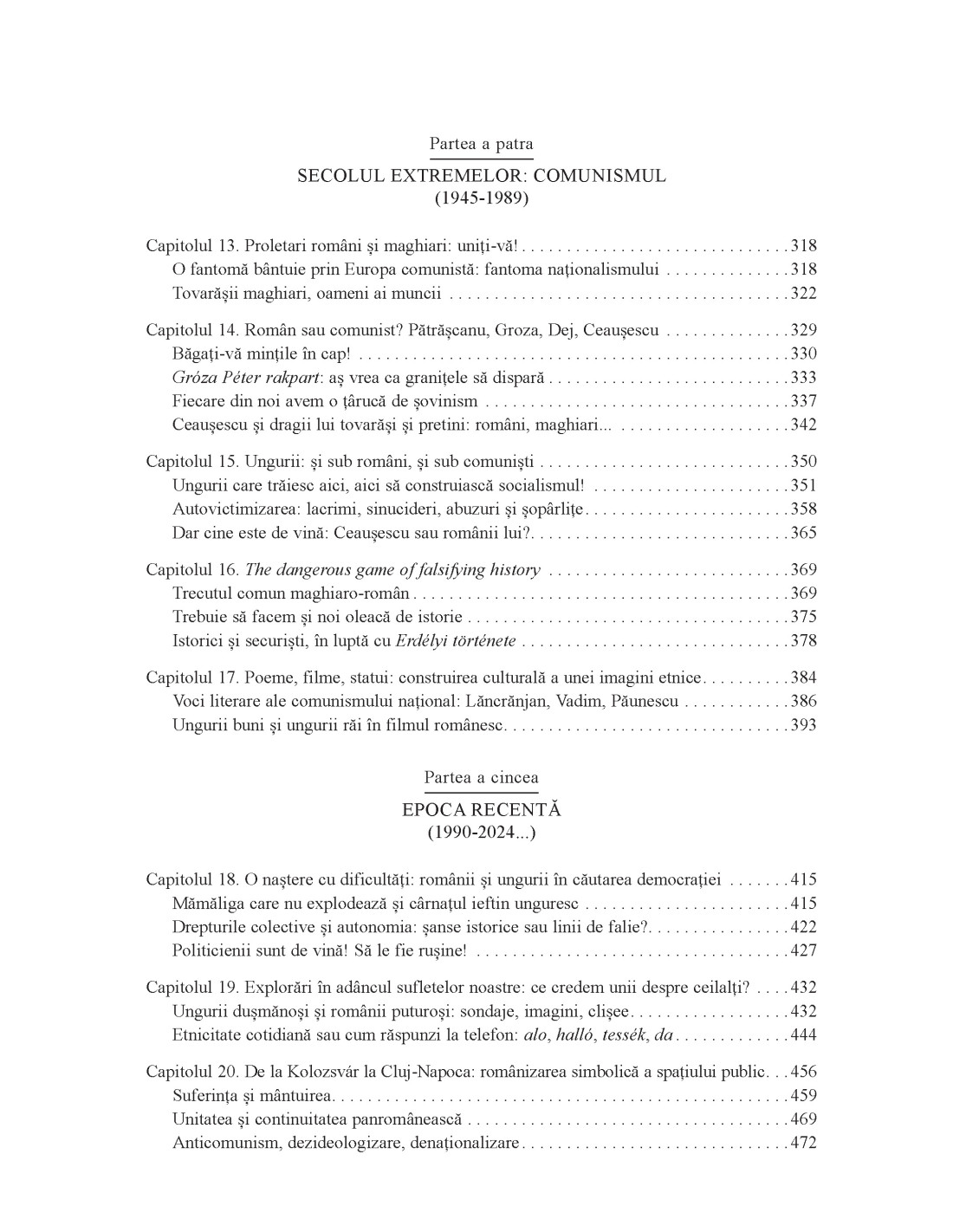 Rădăcinile convieţuirii • Profil genetic, lingvistică, mituri şi bucătărie • Doi urmaşi ai Romei: ungurul cuceritor şi valahul păstor • Adversari, întemeietori şi parteneri în Transilvania • Memorandul şi pâinea neagră a robiei ungureşti • Schimbarea imperiului • Garda, Căpitanul şi arhanghelul maghiar; Eliade şi Cioran • Se poate sau nu se poate să fii minoritar în România? • Gróza Péter rakpart: aş vrea ca graniţele să dispară • Istorici şi securişti, în luptă cu Erdélyi története • Etnicitate cotidiană sau cum răspunzi la telefon: alo, halló, tessék, da • Din înţelepciunea poporului român: bancurile cu unguri • Grădina Zânelor şi Grădina Maicii Domnului: ungurii şi românii în epoca post-adevăr