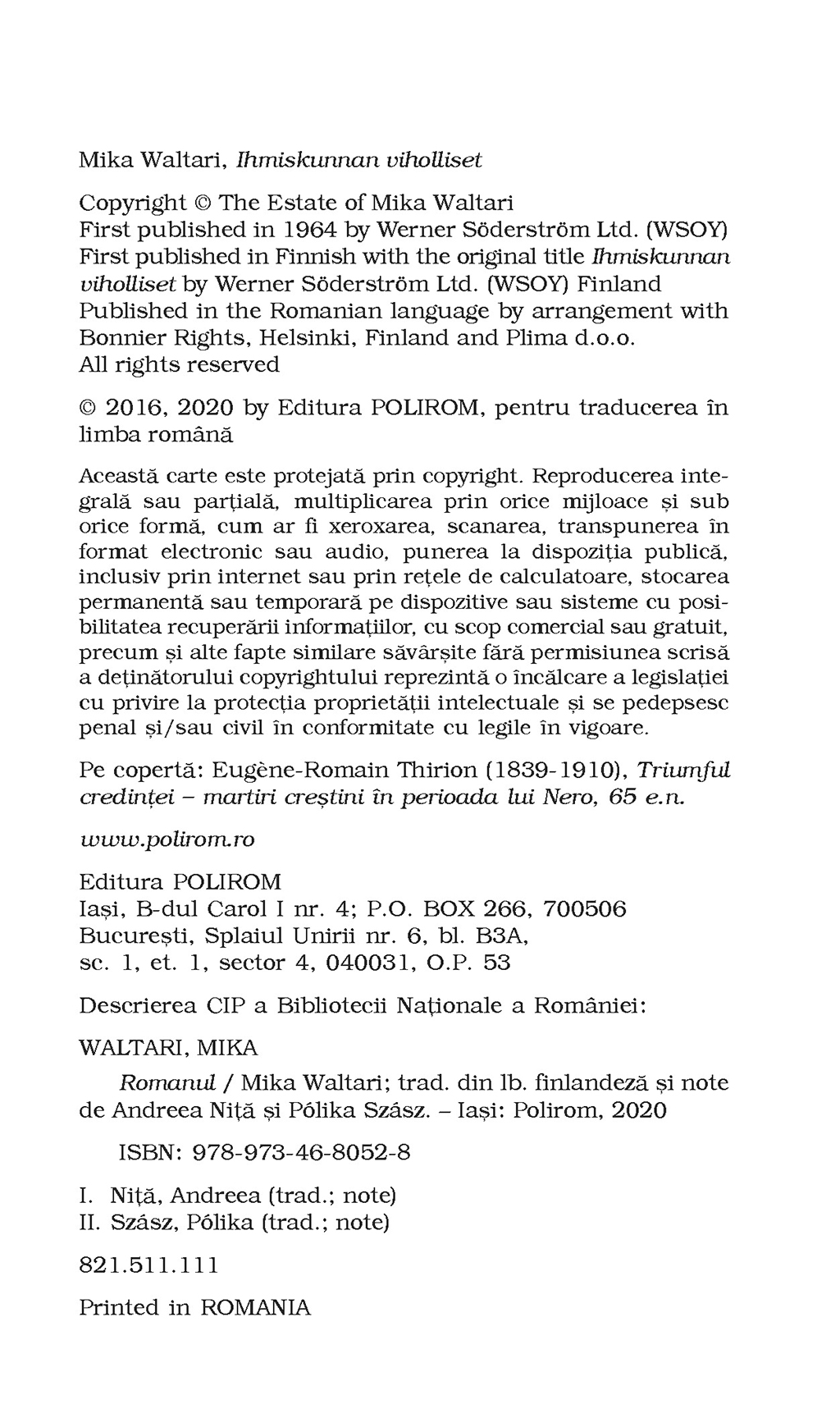 Publicat în anul 1964, Romanul este ultima din seria marilor opere istorice ale lui Mika Waltari, încheind trilogia din care mai fac parte Egipteanul (1945) şi Etruscul (1955). Cartea zugrăveşte destinul lui Minutus Lausus Manilianus, fiul lui Marcus Mezentius din romanul Secretul împărăţiei. Ajuns la vîrsta maturităţii, Minutus îşi scrie memoriile pentru folosul fiului său, reconstituind astfel universul Romei antice din perioada împăraţilor Claudius şi Nero. Minutus îşi începe călătoria la vîrsta de cincisprezece ani şi străbate Imperiul Roman din oraşul natal, Antiohia, pînă în Roma, Britania, Corint şi Ierusalim, trecînd prin numeroase aventuri. Minutus aleargă după faimă, avere şi statut social, însă ajunge să plătească pentru lăcomia lui. Pe lîngă personajele faimoase din istoria Romei, povestea aduce în prim-plan şi începuturile creştinismului, urmărind soarta apostolilor Petru şi Pavel, dar şi persecuţiile împotriva adepţilor noii „superstiţii”.