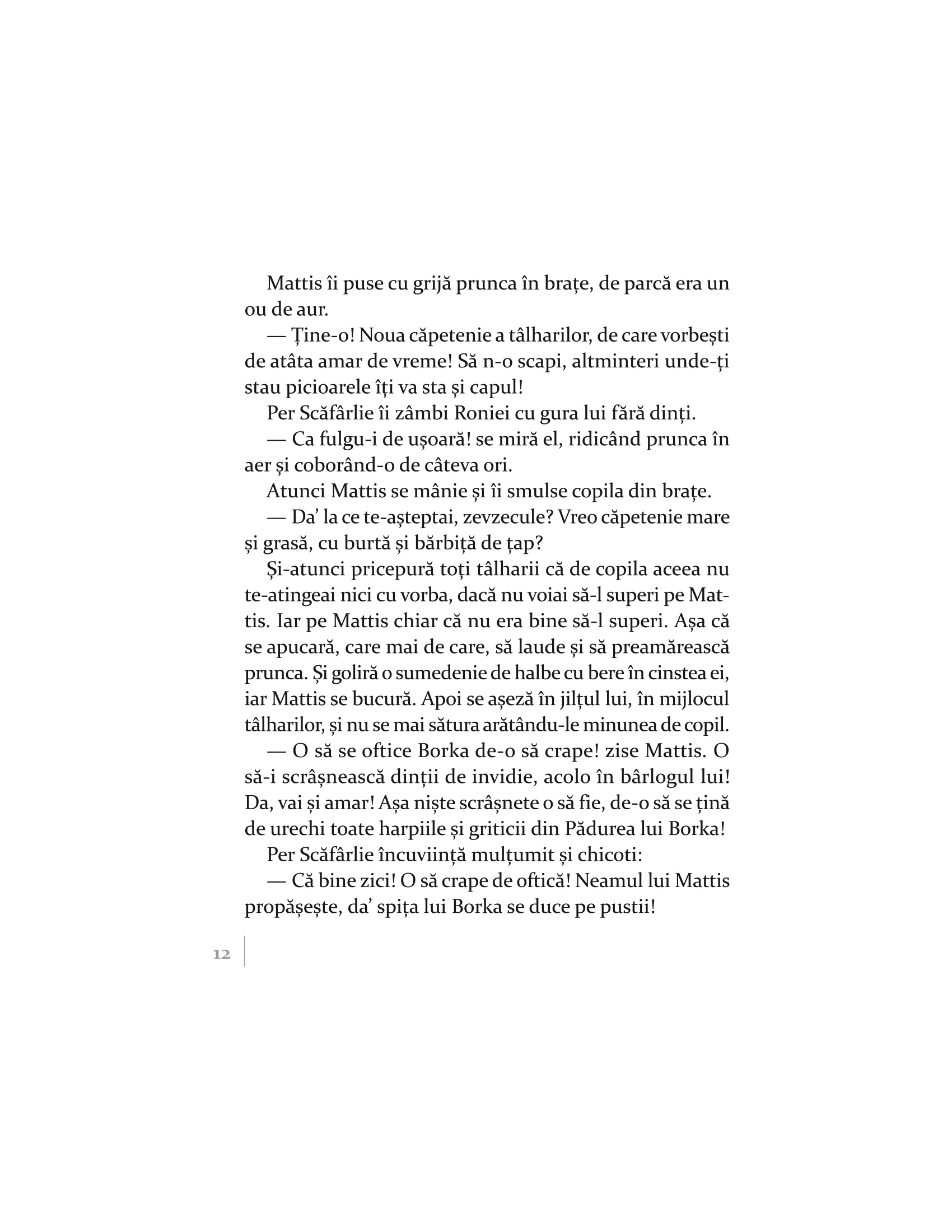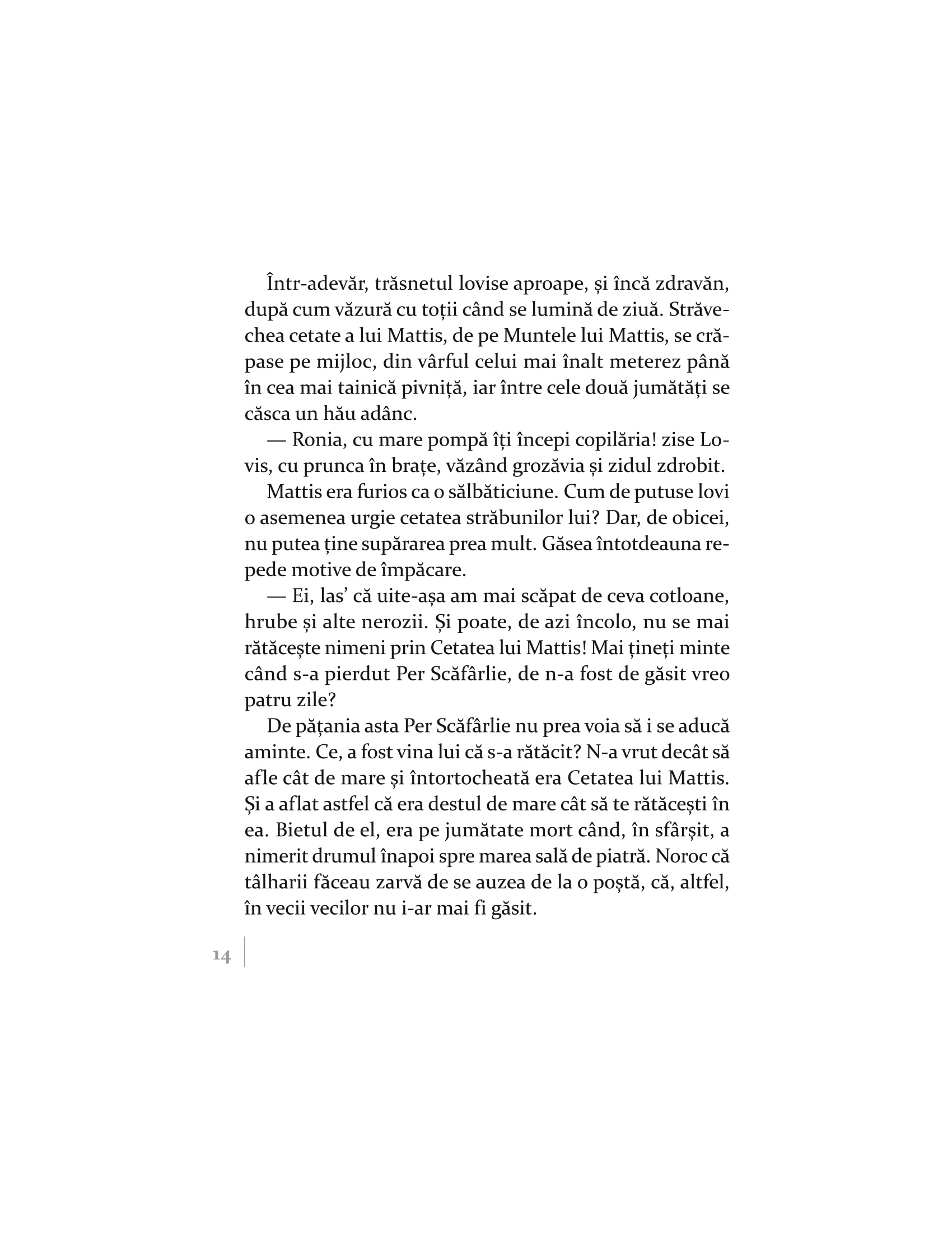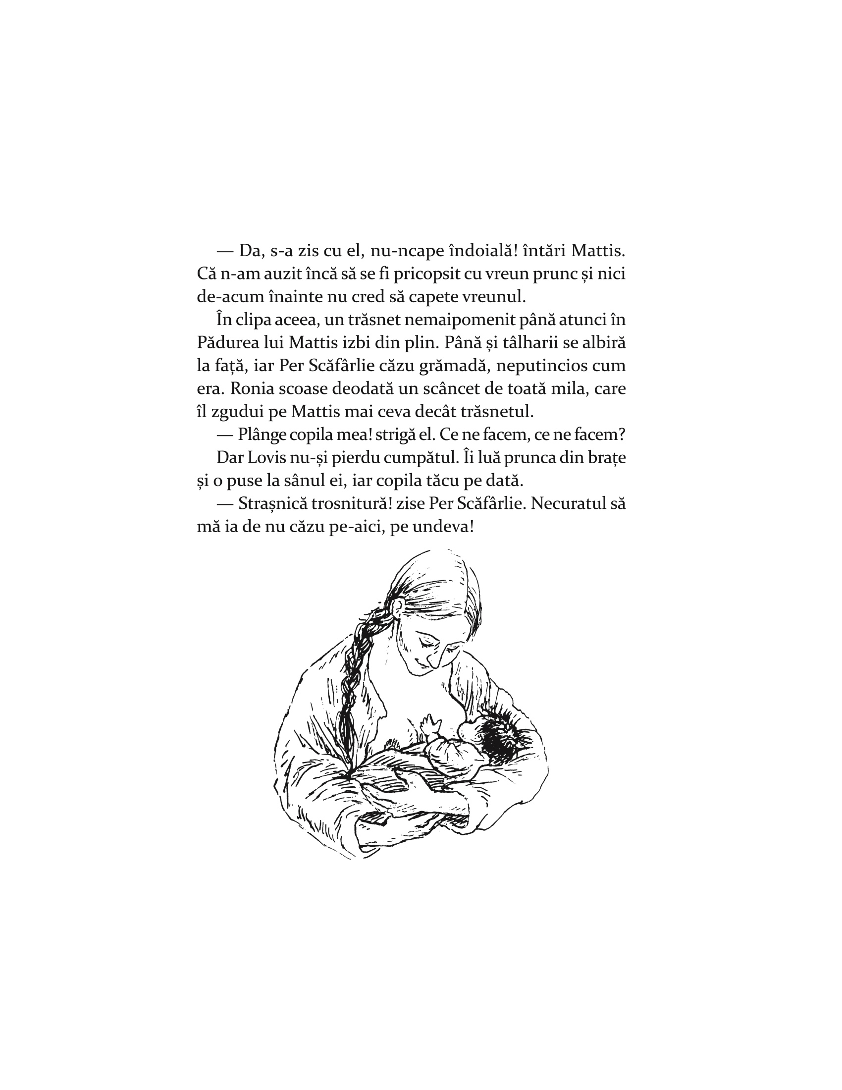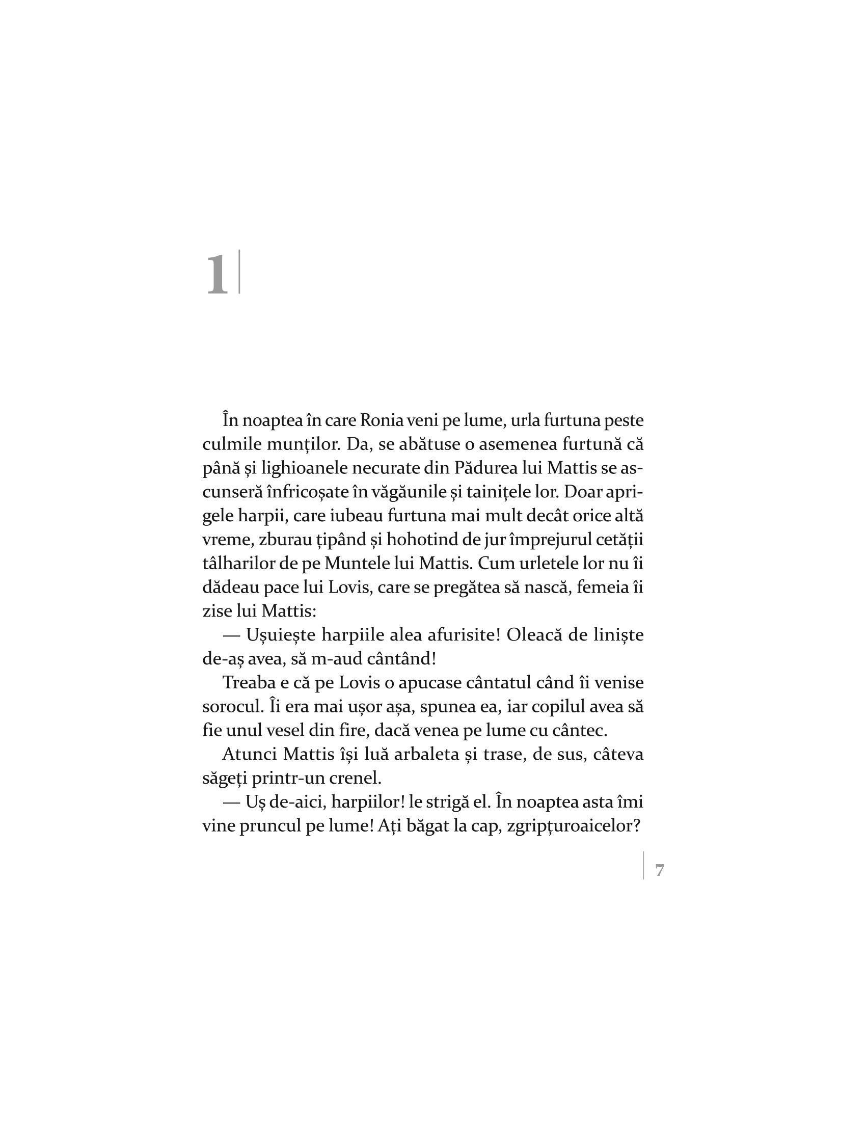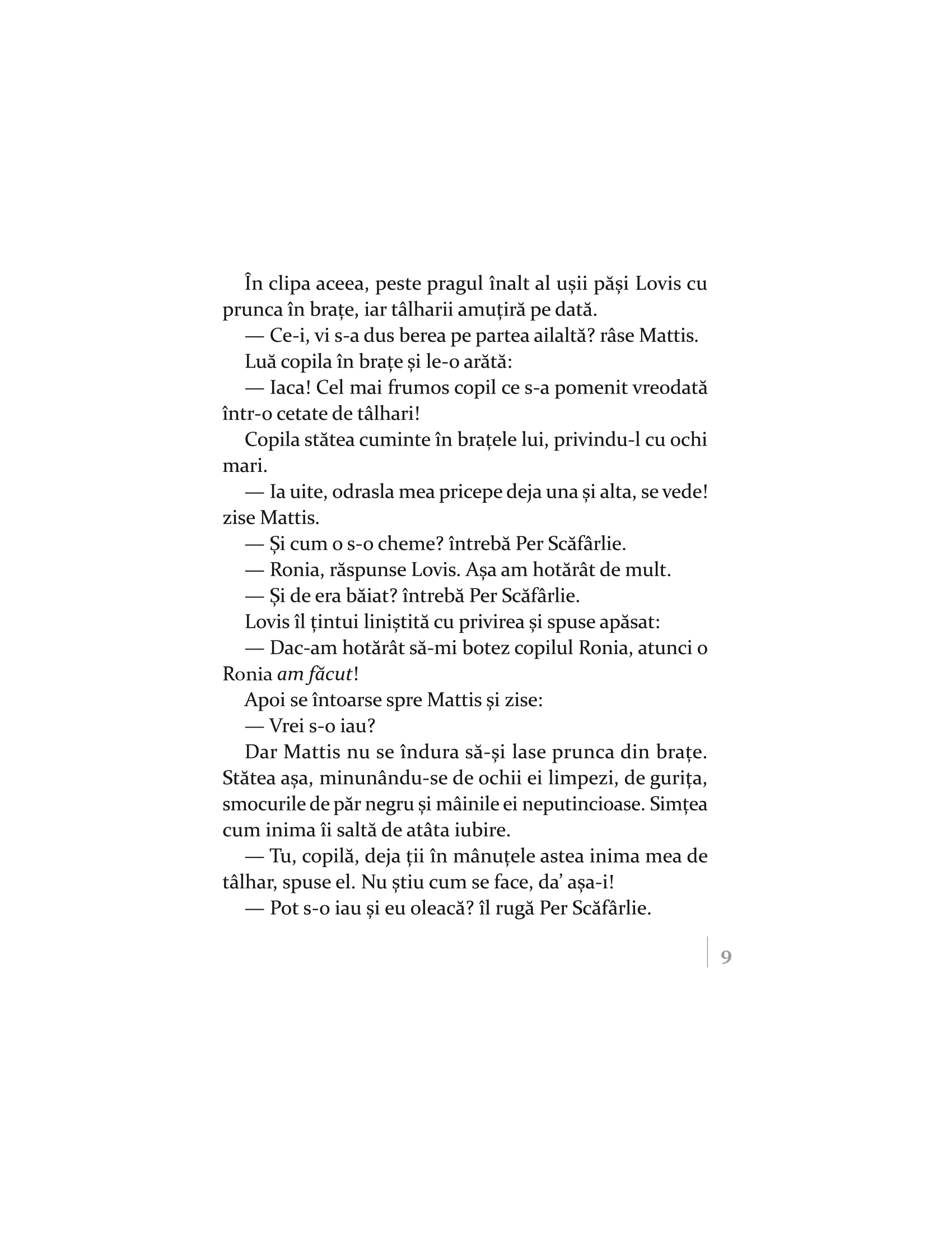 Mare este bucuria în noaptea când se naște Ronia, viitoarea căpetenie a tâlharilor, nici măcar fulgerul care despică Cetatea lui Mattis în două nu o poate știrbi. Copila crește între ziduri de piatră, ferită de pericole și de lumea de-afară, iar singurii oameni pe care-i știe sunt părinții ei și tâlharii. Totul se schimbă când Ronia îl vede în partea cealaltă a cetății pe Birk Borkason, fiul căpeteniei bandei rivale.