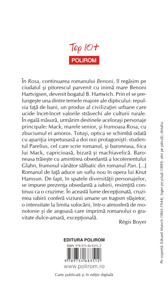 În Rosa, continuarea romanului Benoni, îl regăsim pe ciudatul şi pitorescul parvenit cu inimă mare Benoni Hartvigsen, devenit bogatul B. Hartwich. Prin el se prelungeşte una dintre temele majore ale dipticului: repulsia faţă de bani, un produs al civilizaţiei urbane care ucide încet-încet valorile străvechi ale culturii rurale. În egală măsură, urmărim destinele aceloraşi personaje principale: Mack, marele senior, şi frumoasa Rosa, cu zbuciumul ei amoros. Totuşi, optica se schimbă odată cu apariţia impetuoasă a doi noi protagonişti: studentul Parelius, cel care scrie romanul, şi baroneasa, fiica lui Mack, capricioasă, bizară şi machiavelică. Baroneasa trăieşte cu amintirea obsedantă a locotenentului Glahn, frumosul vînător sălbatic din romanul Pan. [...] Romanul de faţă aduce un suflu nou în opera lui Knut Hamsun. De fapt, în spatele diversităţii personajelor, se impune prezenţa obsedantă a iubirii, resimţită continuu ca o cruzime. În această lume decepţionată, cruzimea iubirii conferă viziunii umane un tragism sfîşietor, o intensitate la limita sufocării, într-o atmosferă de monotonie şi de angoasă care imprimă romanului o gravitate dulce-amară, excepţională.