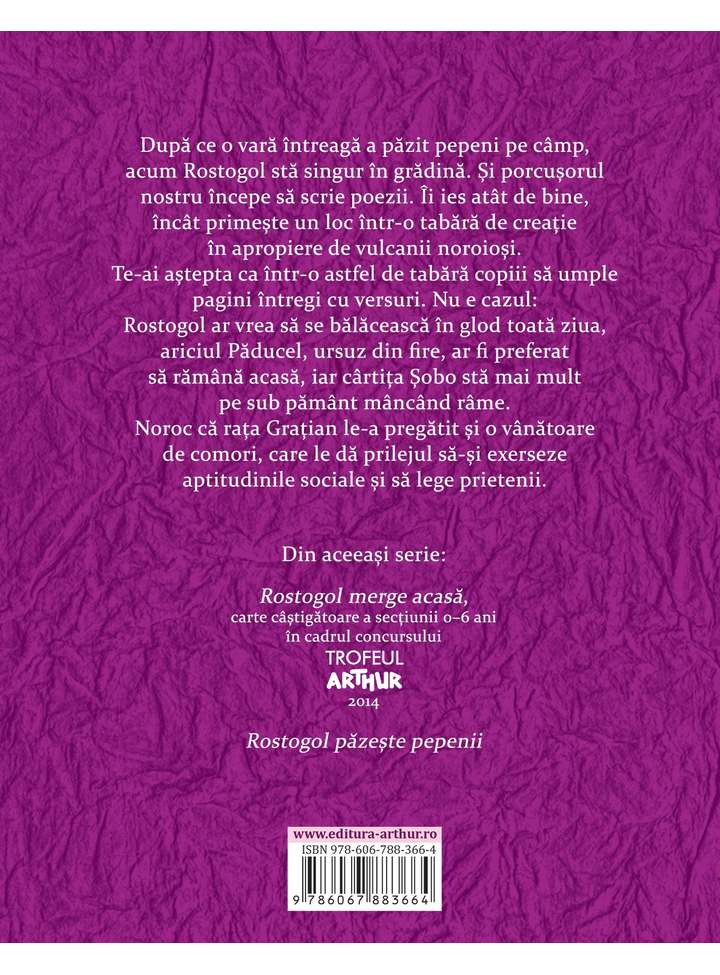 După ce o vară întreagă a păzit pepeni pe câmp, acum Rostogol stă singur în grădină. Și porcușorul nostru începe să scrie poezii. Îi ies atât de bine, încât primește un loc într-o tabără de creație în apropiere de vulcanii noroioși. Te-ai aștepta ca într-o astfel de tabără copiii să umple pagini întregi cu versuri. Nu e cazul: Rostogol ar vrea să se bălăcească în glod toată ziua, ariciul Păducel, ursuz din fire, ar fi preferat să rămână acasă, iar cârtița Șobo stă mai mult pe sub pământ mâncând râme. Noroc că rața Grațian le-a pregătit și o vânătoare de comori, care le dă prilejul să-și exerseze aptitudinile sociale și să lege prietenii.