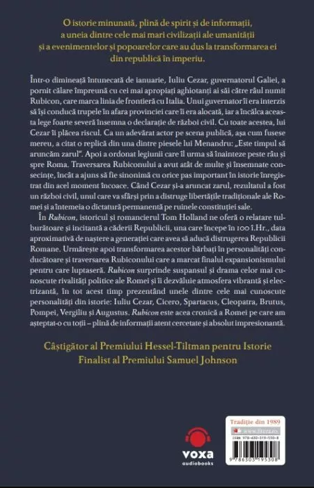 În Rubicon, istoricul și romancierul Tom Holland ne oferă o relatare tulburătoare și incitantă a căderii Republicii, una care începe în 100 î.Hr., data aproximativă de naștere a generației care avea să aducă distrugerea Republicii Romane. Urmărește apoi transformarea acestor bărbați în personalități conducătoare și traversarea Rubiconului care a marcat finalul expansionismului pentru care luptaseră. Rubicon surprinde suspansul și drama celor mai cunoscute rivalități politice ale Romei și îi dezvăluie atmosfera vibrantă și electrizantă, în tot acest timp prezentând unele dintre cele mai cunoscute personalități din istorie: Iuliu Cezar, Cicero, Spartacus, Cleopatra, Brutus, Pompei, Vergiliu și Augustus. Rubicon este acea cronică a Romei pe care am așteptat-o cu toții – plină de informații atent cercetate și absolut impresionantă.