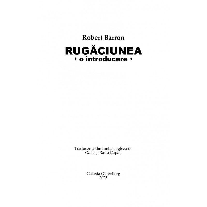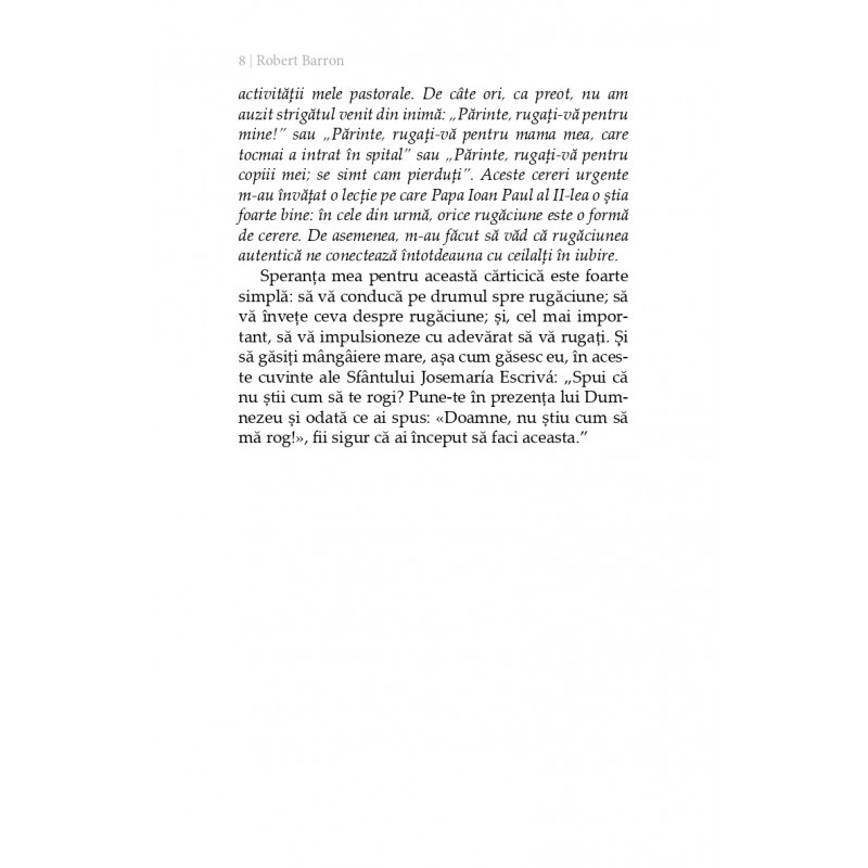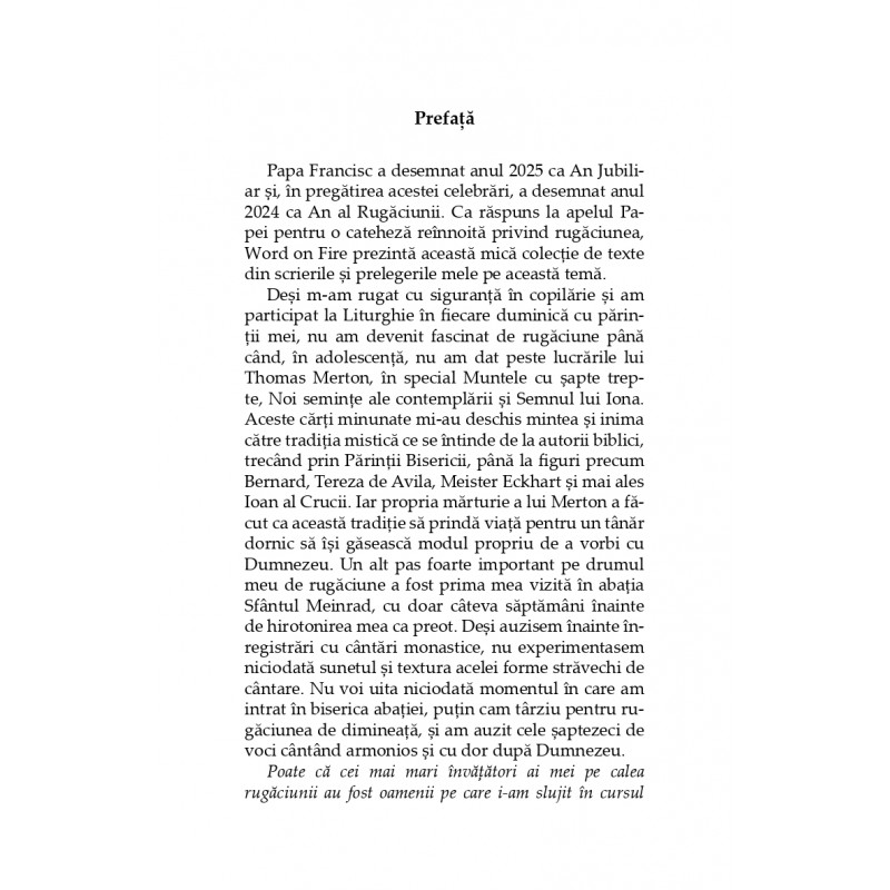 Cartea ne oferă o colecție de reflecții profunde, dar concise, despre rugăciunea în tradiția spirituală catolică, de la autorul, vorbitorul şi teologul consacrat, episcop Robert Barron, care explorează răspunsuri la întrebări precum: