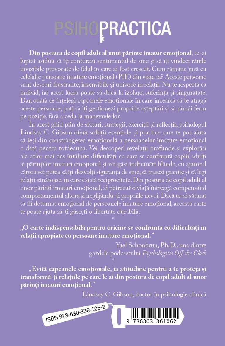 Vei descoperi revelatii profunde si explorari ale celor mai des intalnite dificultati cu care se confrunta copiii adulti ai parintilor imaturi emotional si vei gasi indrumari blande, cu ajutorul carora vei putea sa iti dezvolti siguranta de sine, sa trasezi granite si sa legi relatii sanatoase, in care exista reciprocitate. Din postura de copil adult al unor parinti imaturi emotional, ai petrecut o viata intreaga compensand comportamentul altora si neglijandu-ti propriile nevoi. Daca te-ai saturat sa fii deturnat emotional de persoanele imature emotional, aceasta carte te poate ajuta sa-ti gasesti o libertate durabila.
