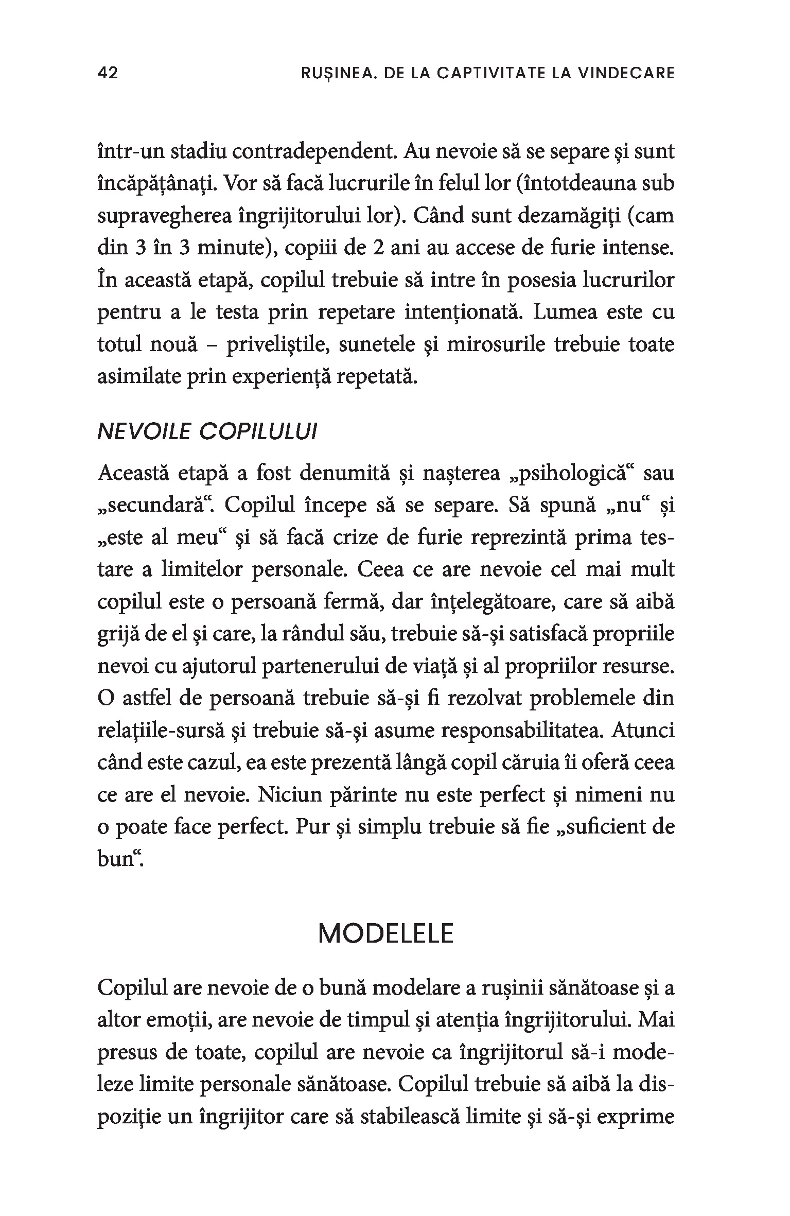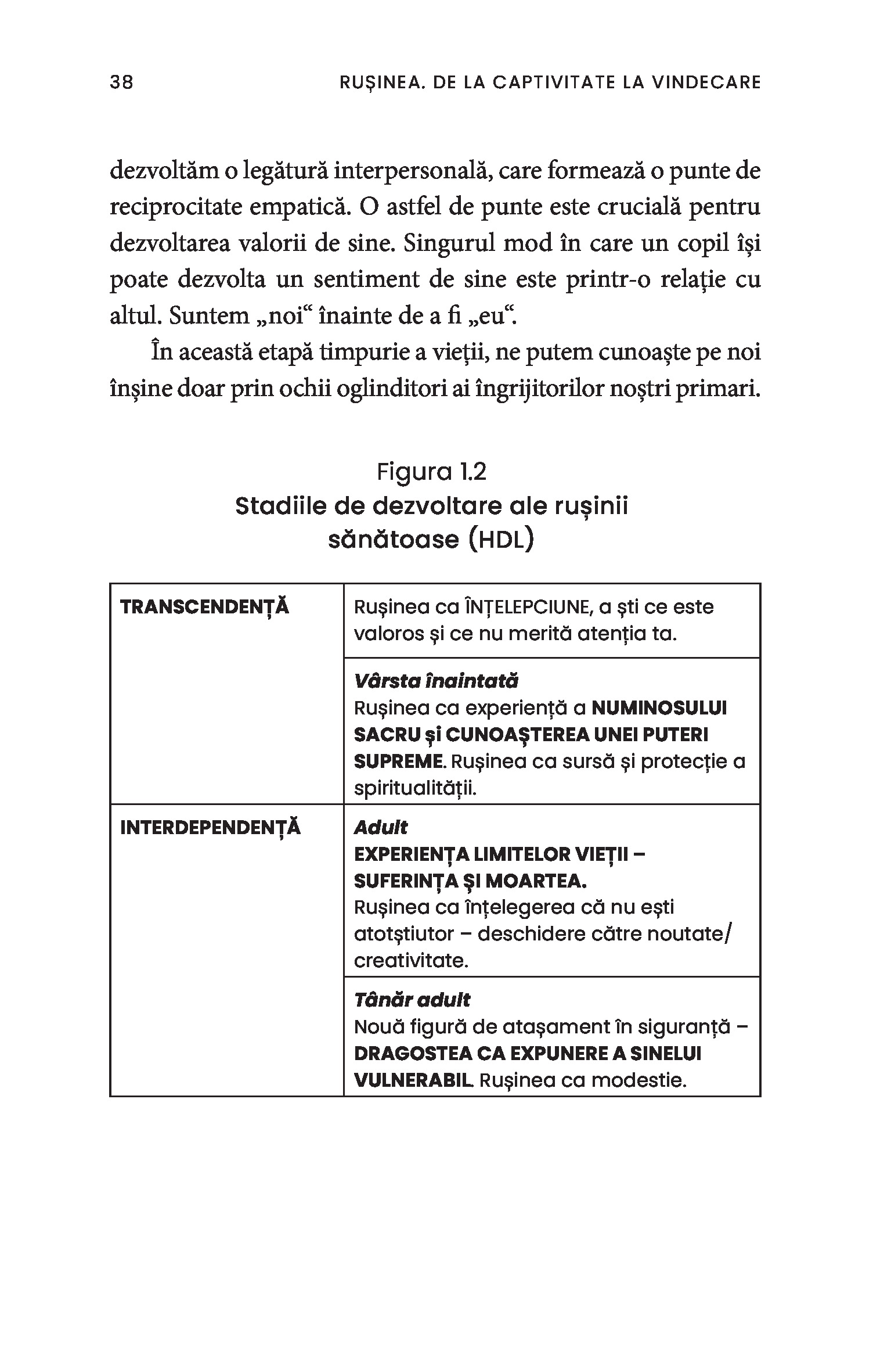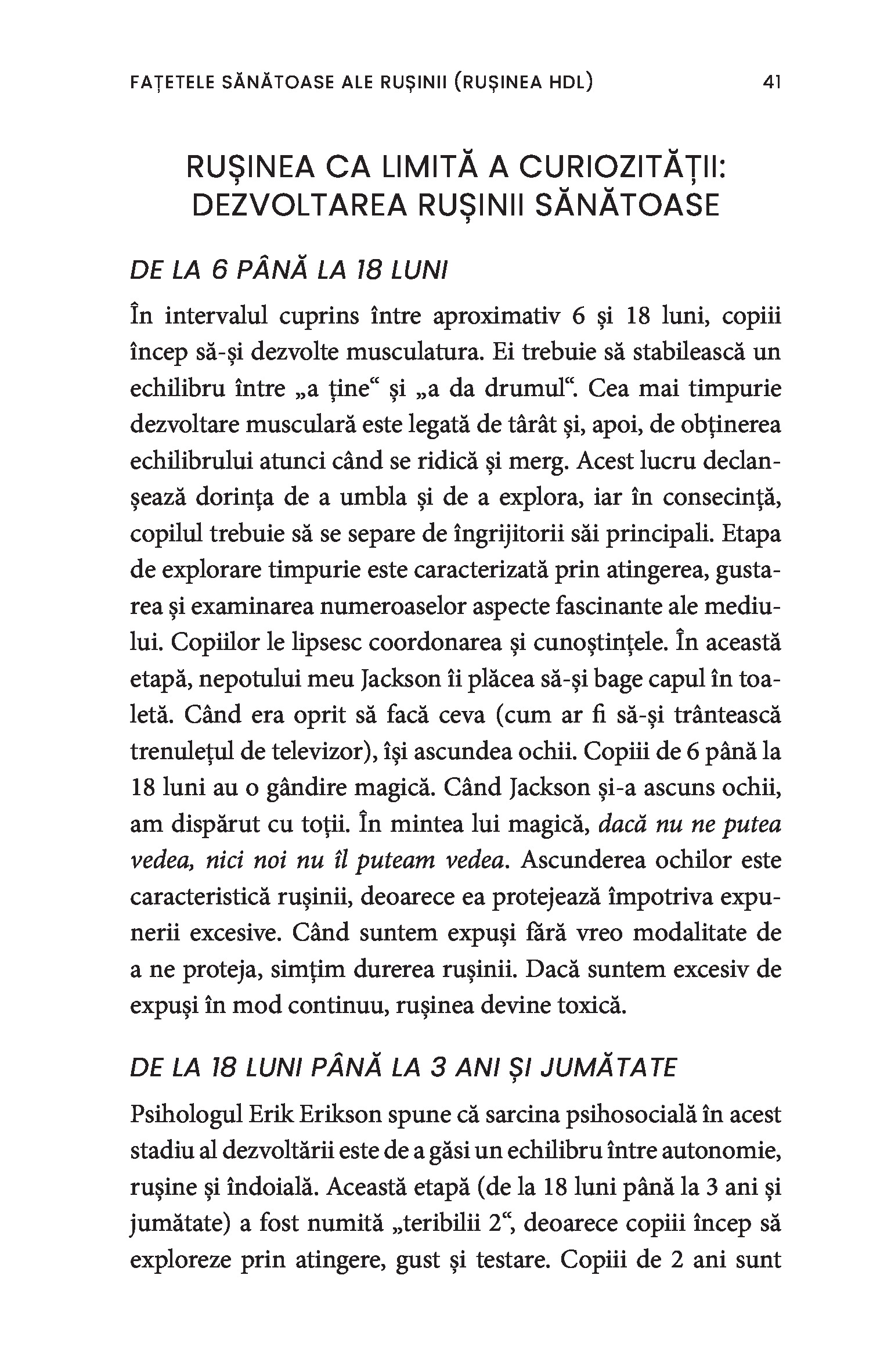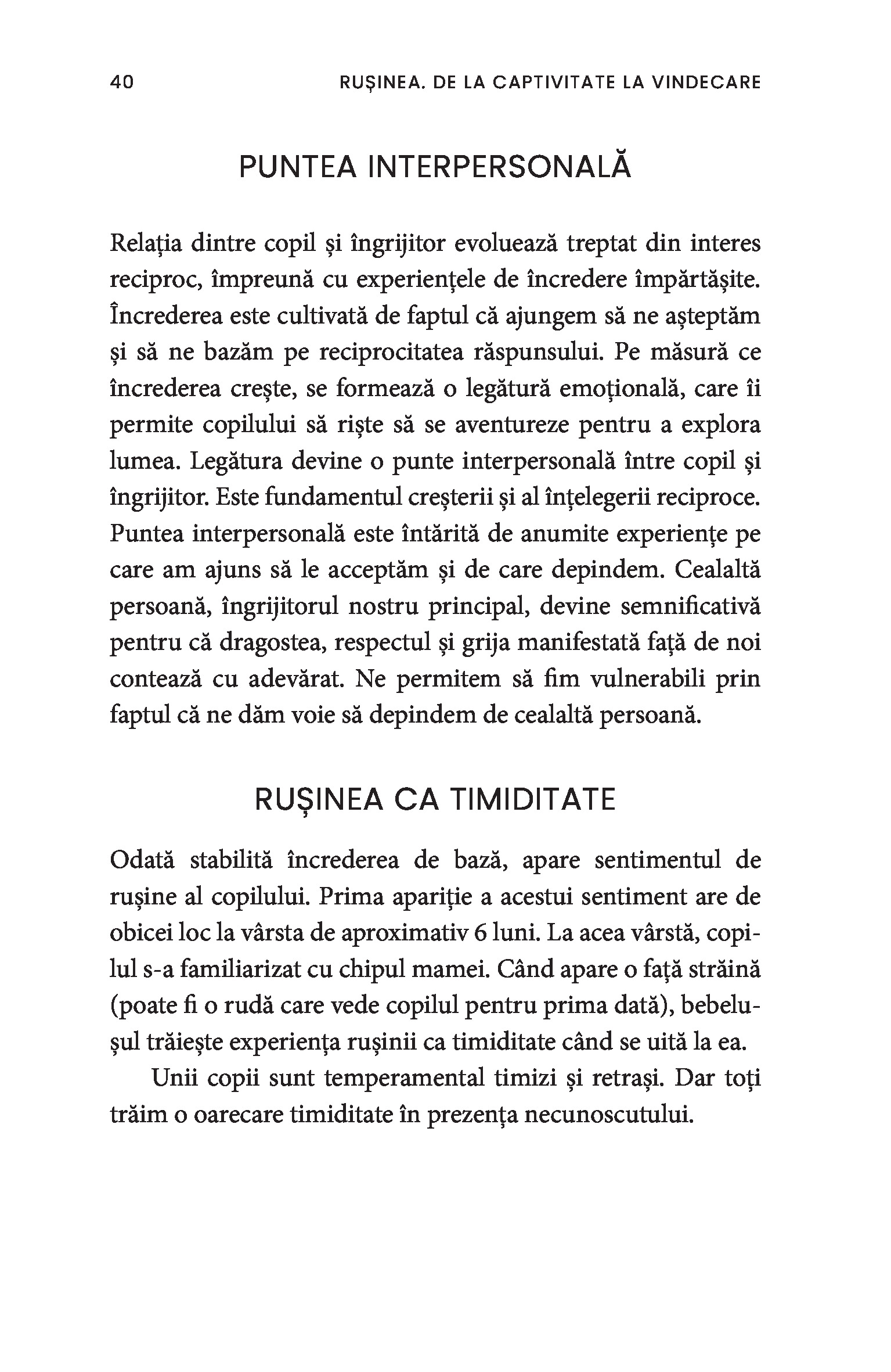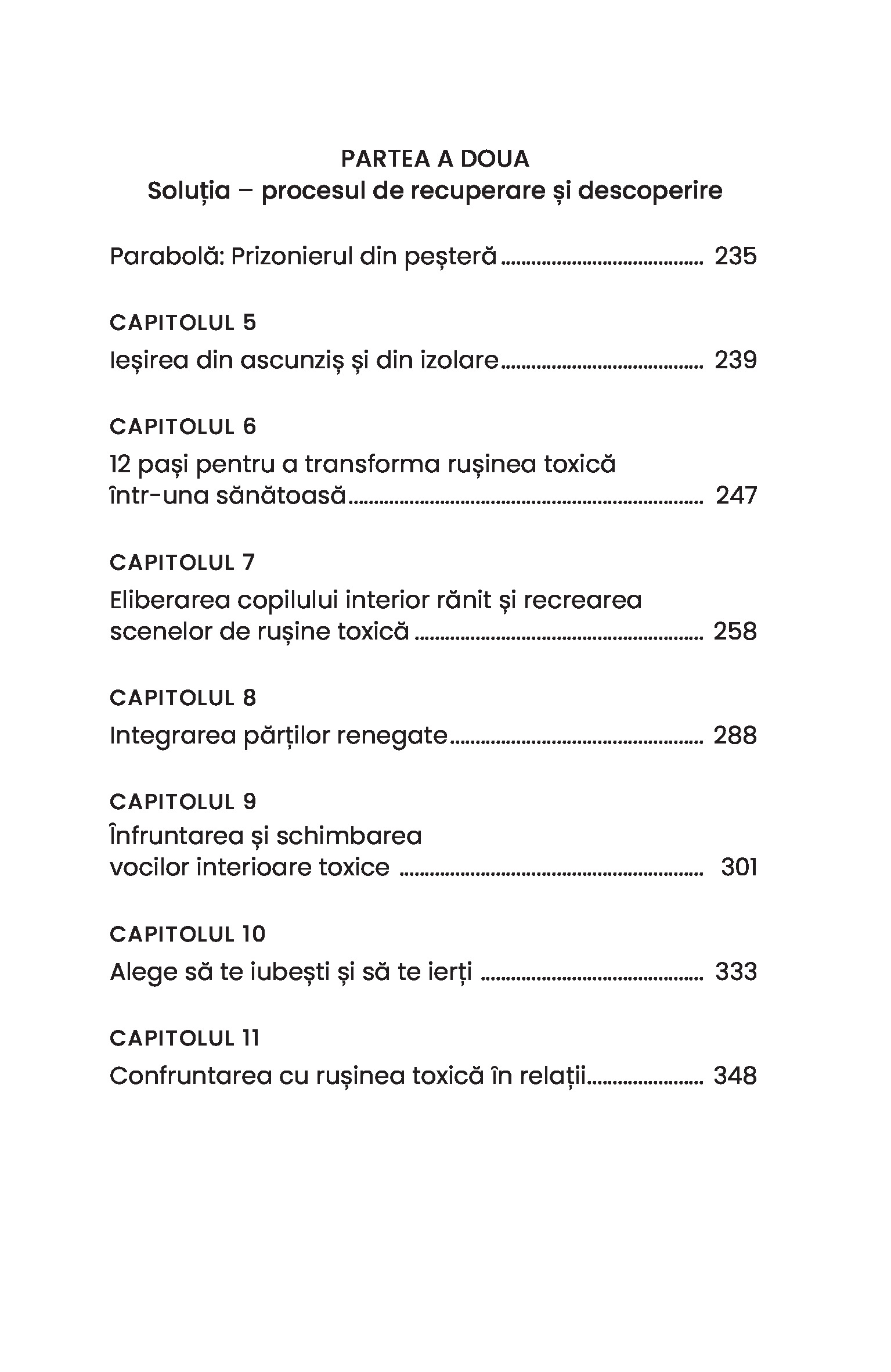 Cu cât aflăm mai mulți secretele întunecate ale acestei emoții distructive, cu atât mai puțină putere și control va avea ea asupra noastră. Rușinea este un ghid minunat atât pentru publicul larg, cât și pentru specialiștii în psihologie, din care aflăm geneza rușinii, felul în care este transmisă la nivel inconștient de către familie și modurile multifațetate prin care îți ruinează viața atunci când nu ești conștient de prezența ei.