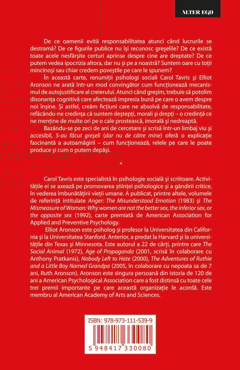 In aceasta carte, renumitii psihologi sociali Carol Tavris si Elliot Aronson ne arata intr-un mod convingator cum funcționeaza mecanismul de autojustificare al creierului. Atunci cand gresim, trebuie sa potolim disonanta cognitiva care afecteaza impresia buna pe care o avem despre noi insine. Si astfel, cream fictiuni care ne absolva de responsabilitate, refacandu-ne credinta ca suntem destepti, morali si drepti – o credinta ce ne mentine de multe ori pe o cale prosteasca, imorala si nedreapta.