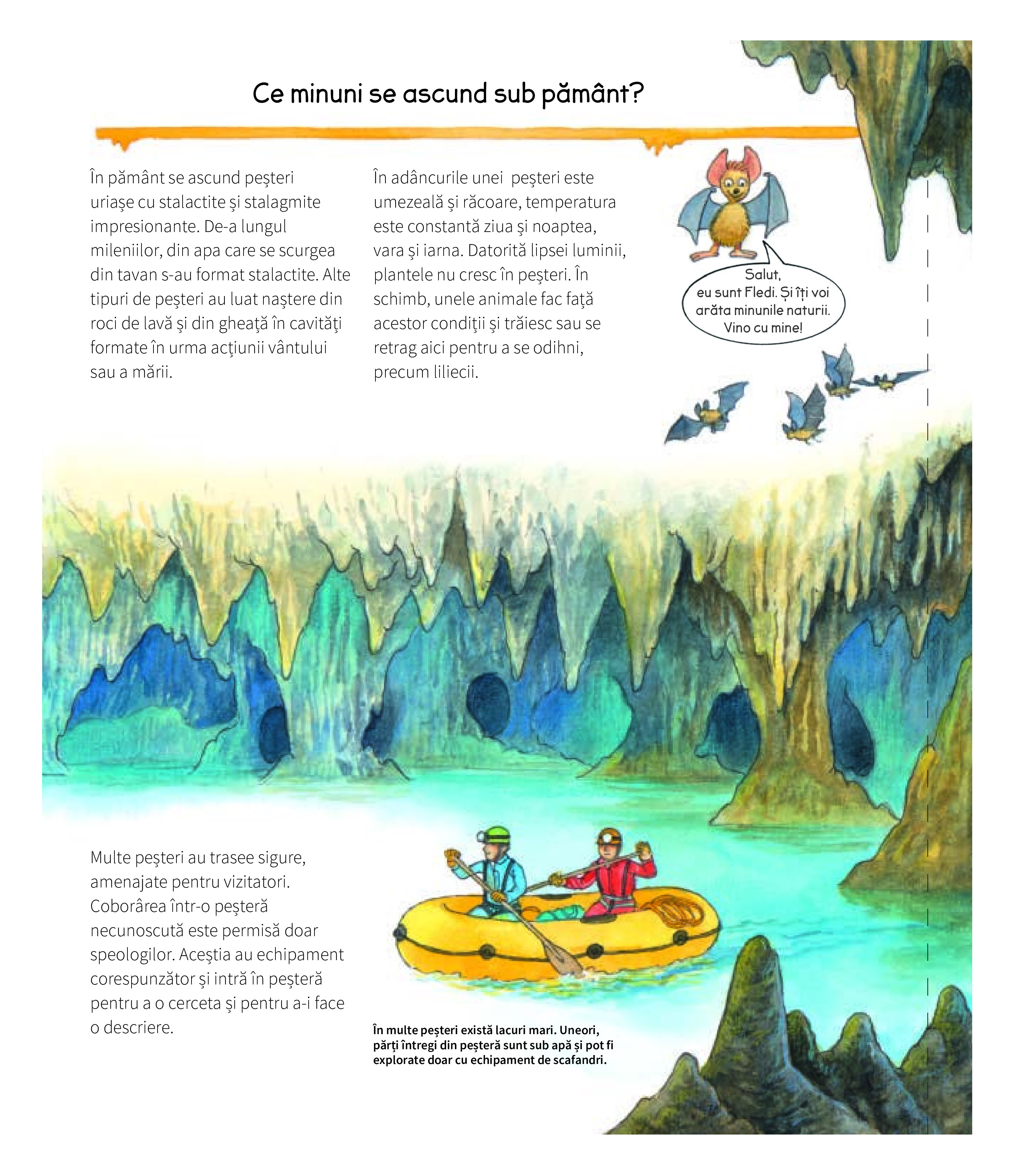 Cartea e o expediție imaginară printre cele mai fascinante spectacole ale naturii. Deschide ferestrele de pe paginile cartonate și vei pătrunde în adâncurile celor mai misterioase peșteri înțesate cu stalactite, vei urca pe cele mai înalte culmi și te vei scufunda ca un aisberg antarctic.