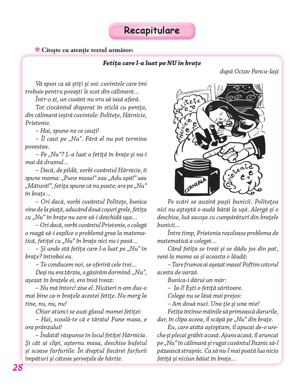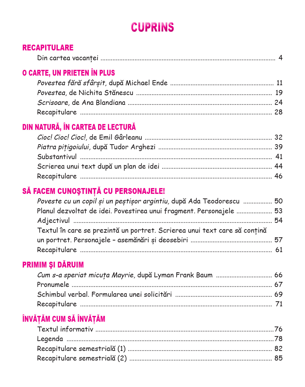 Realizată conform noii programe, aprobată prin O.M. nr. 5003/02.12.2014, lucrarea aplică viziunea interdisciplinară integrată, cu accent pe comunicare. Aceasta urmăreşte succesiunea temelor din manualul de Limba şi literatura română. Clasa a IV-a – Semestrul I.