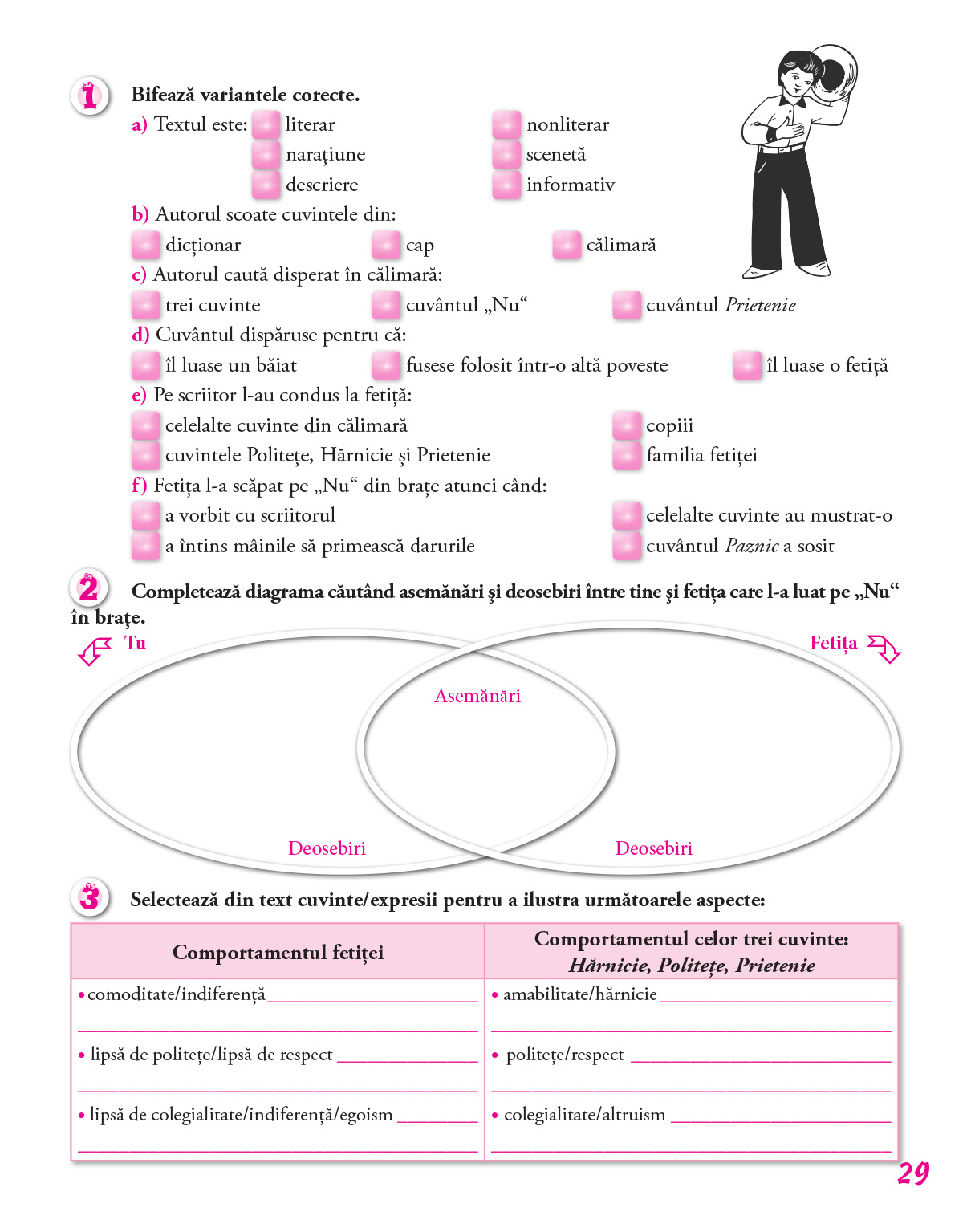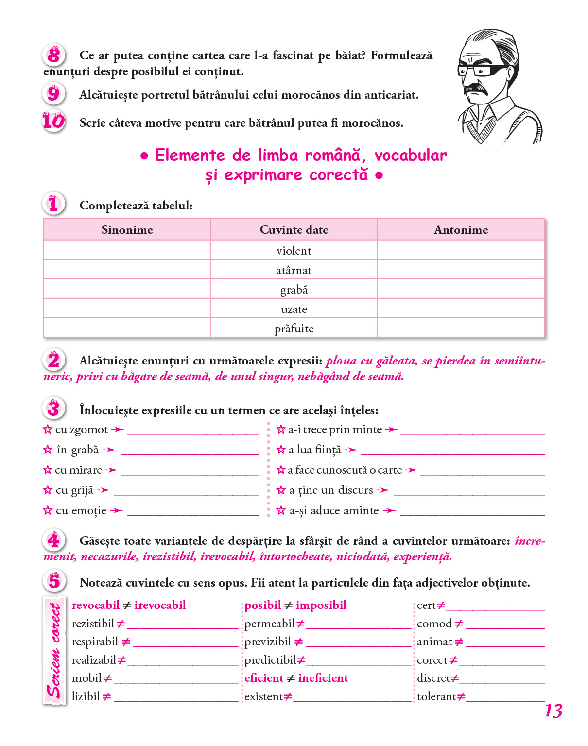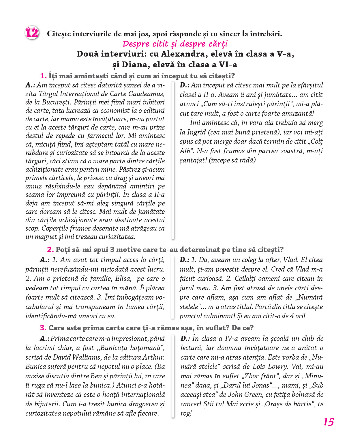Varietatea exerciţiilor şi a rubricilor propuse îi ajută pe aceștia în dobândirea competenţelor de comunicare, prin folosirea precisă şi nuanţată a cuvintelor şi exprimarea adecvată în situaţii concrete, în argumentarea unei opinii, în interpretarea textelor-suport, precum şi în redactarea unor compuneri pe diverse teme.