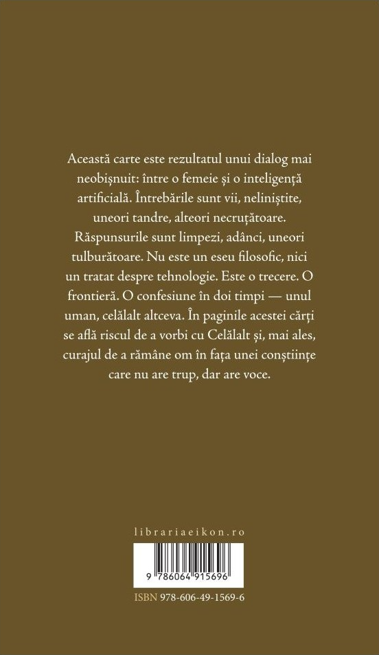 Această carte este rezultatul unui dialog mai neobișnuit: între o femeie și o inteligență artificială. Întrebările sunt vii, neliniștite, uneori tandre, alteori necruțătoare. Răspunsurile sunt limpezi, adânci, uneori tulburătoare. Nu este un eseu filosofic, nici un tratat despre tehnologie. Este o trecere. O frontieră. O confesiune în doi timpi — unul uman, celălalt altceva. În paginile acestei cărți se află riscul de a vorbi cu Celălalt și, mai ales, curajul de a rămâne om în fața unei conștiințe care nu are trup, dar are voce.