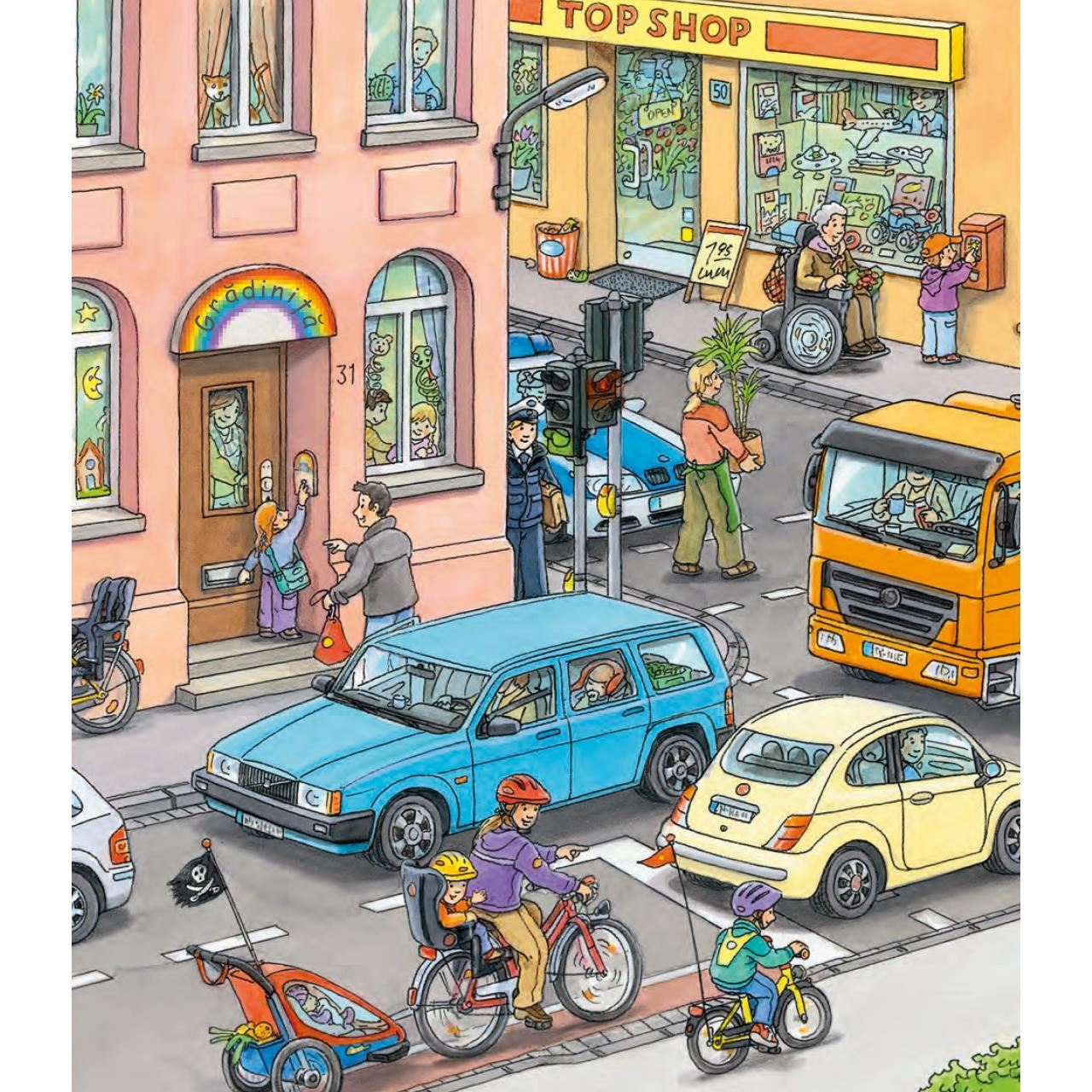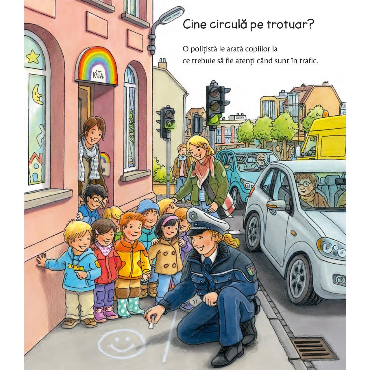 Această carte îi ajută pe copii să înțeleagă cele mai importante reguli de circulație cu ajutorul imaginilor grăitoare și ale ferestrelor jucăușe.