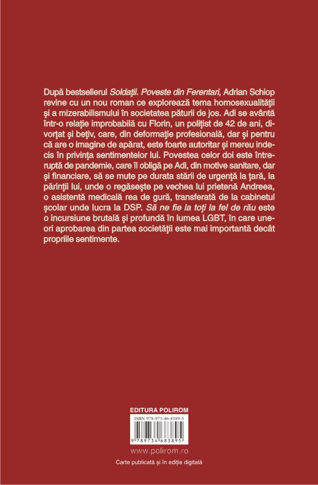 După bestsellerul Soldații. Poveste din Ferentari, Adrian Schiop revine cu un nou roman ce explorează tema homosexualității și a mizerabilismului în societatea păturii de jos. Adi se avîntă într-o relație improbabilă cu Florin, un polițist de 42 de ani, divorțat și bețiv, care, din deformație profesională, dar și pentru că are o imagine de apărat, este foarte autoritar și mereu indecis în privința sentimentelor lui. Povestea celor doi este întreruptă de pandemie, care îl obligă pe Adi, din motive sanitare, dar și financiare, să se mute pe durata stării de urgență la țară, la părinții lui, unde o regăsește pe vechea lui prietenă Andreea, o asistentă medicală rea de gură, transferată de la cabinetul școlar unde lucra la DSP. Să ne fie la toți la fel de rău este o incursiune brutală și profundă în lumea LGBT, în care uneori aprobarea din partea societății este mai importantă decît propriile sentimente.